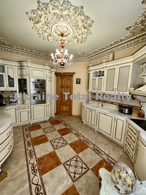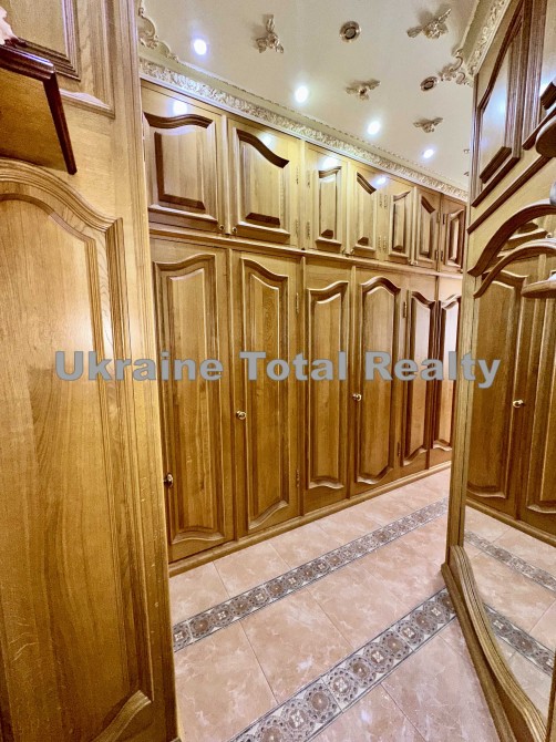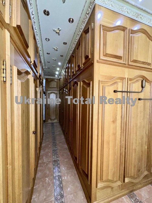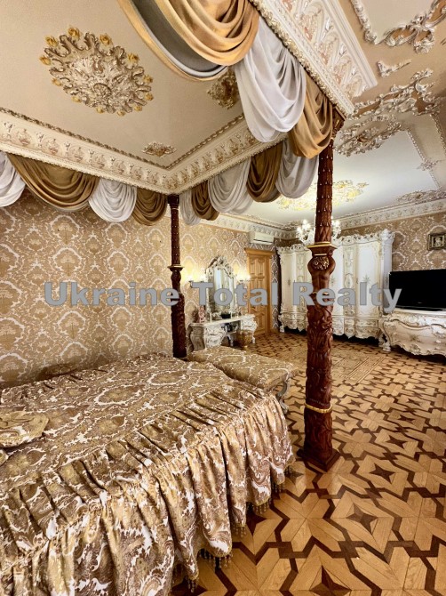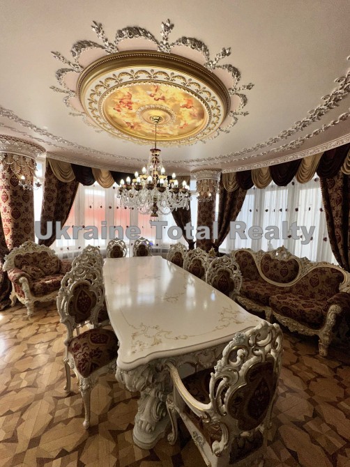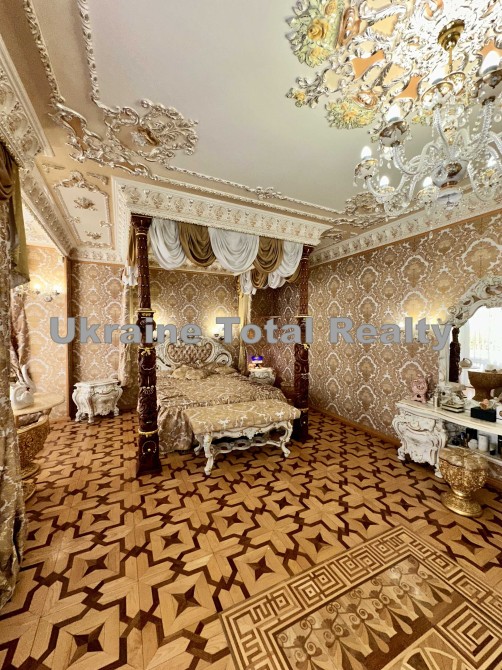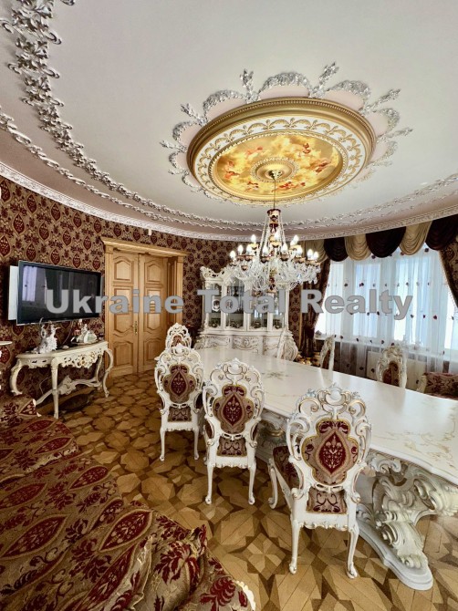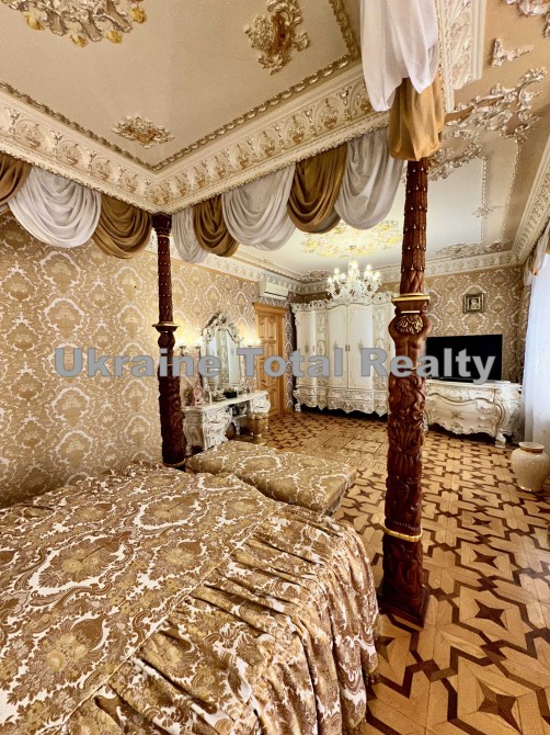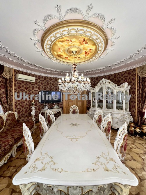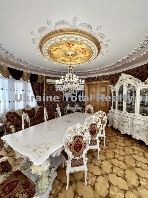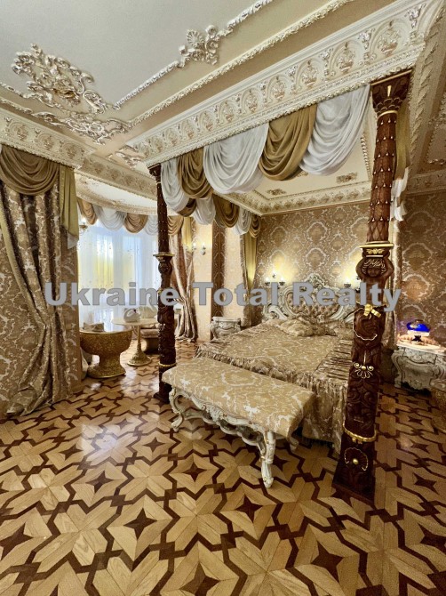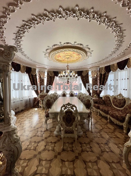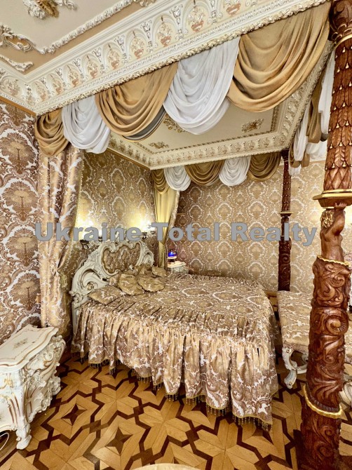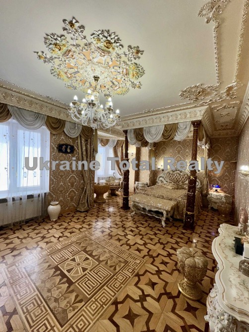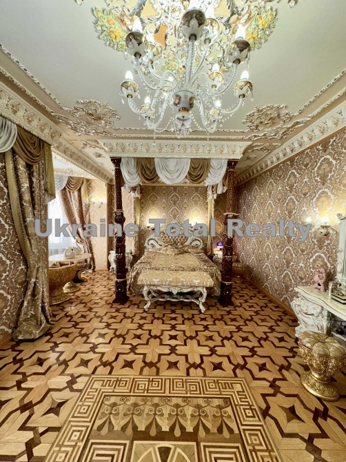 Вся столярка з добірного натурального дуба та ясеня (масив). Драпірування стін та м'яких меблів тканинами: шовком та гобеленом Італія. На стелях ліплення з гіпсу та художній розпис. На підлогах мармур та художній паркет. Меблі Ексклюзивні, різьблені, Італія (Silik).