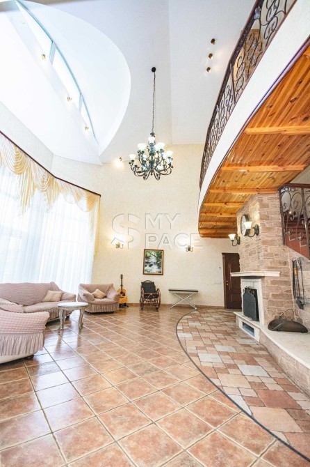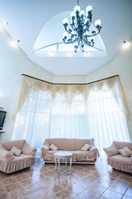 1-й поверх: простора вітальня з каміном, гостьова кімната, кухня з необхідною технікою та фільтрацією води, санвузол, гардеробна/комора, зона відпочинку — сауна, хамам, інфрачервона кабіна з виходом безпосередньо до басейну, вихід до гаражу з підсобним приміщенням та виходом до власного укриття.