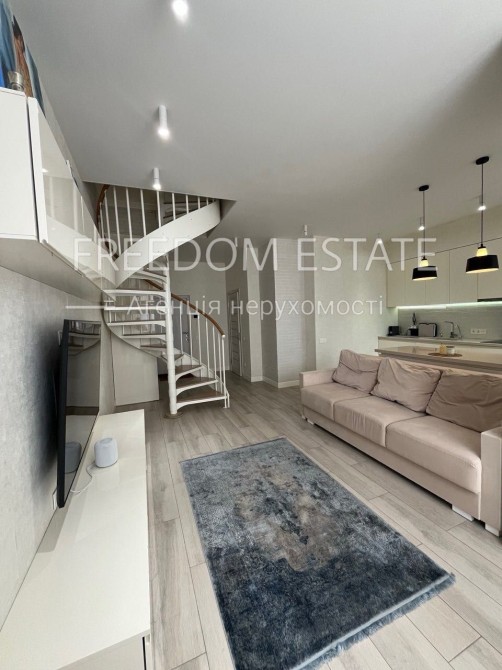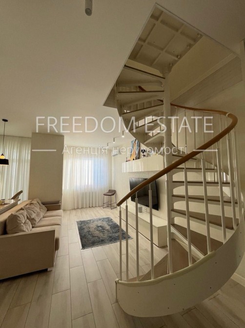 Изюминка квартиры — красивая винтовая лестница с деревянными ступенями и белыми перилами, придающая интерьеру элегантность и легкость.