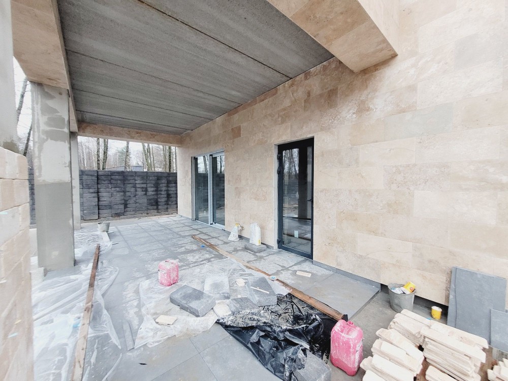 Фасад: травертин + термодерево
