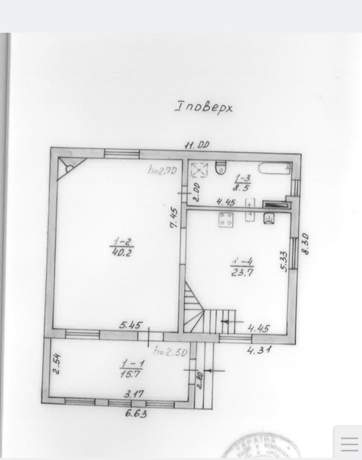 1 поверх: коридор, велика зала з діючим каміном (додатковий обігрів всього будинку), кухня, санвузол.