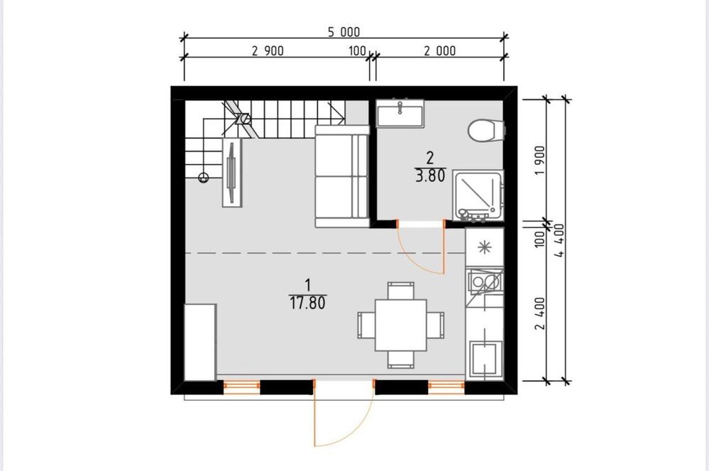 Площа 42м2 достатньо для невеликої сімʼї або як дача для відпочинку. До того ж є маленький дворик, де можна організувати невеликий сад або зону для відпочинку на свіжому повітрі.