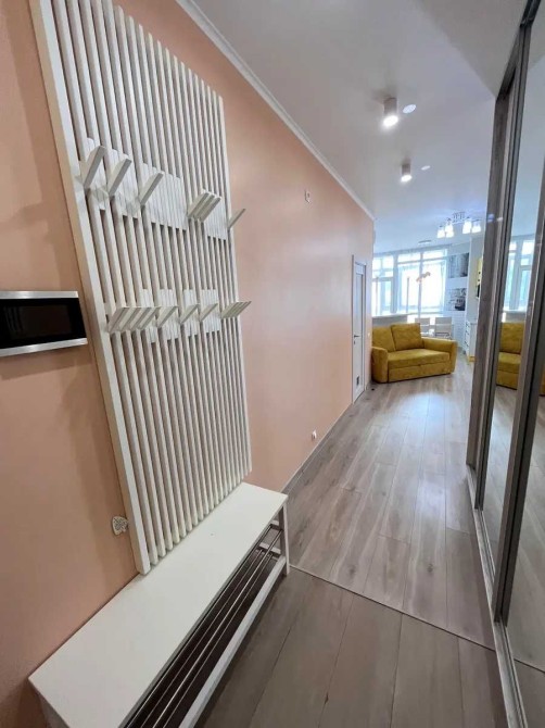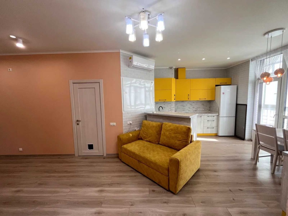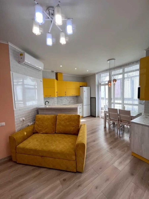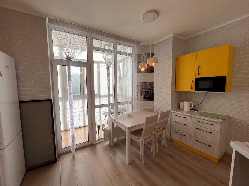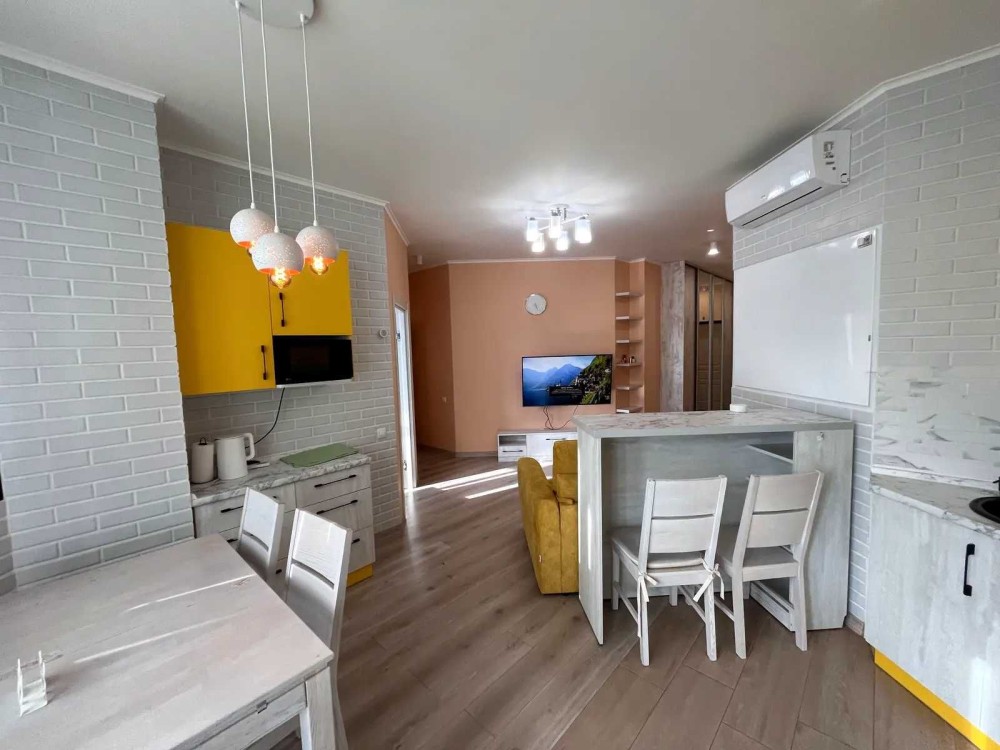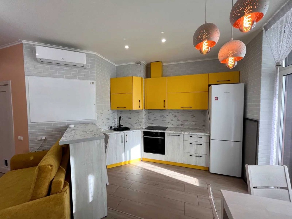 Кухня-студія укомплектована: духова шафа, холодильник, варочна поверхня, мікрохвильова піч, посудомийна машин, кондиціонер.