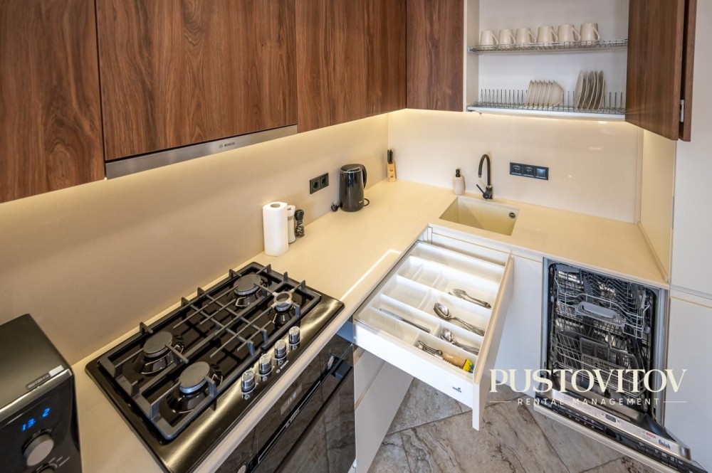 -Есть посудомойка, тёплый пол, интернет оптоволокно.