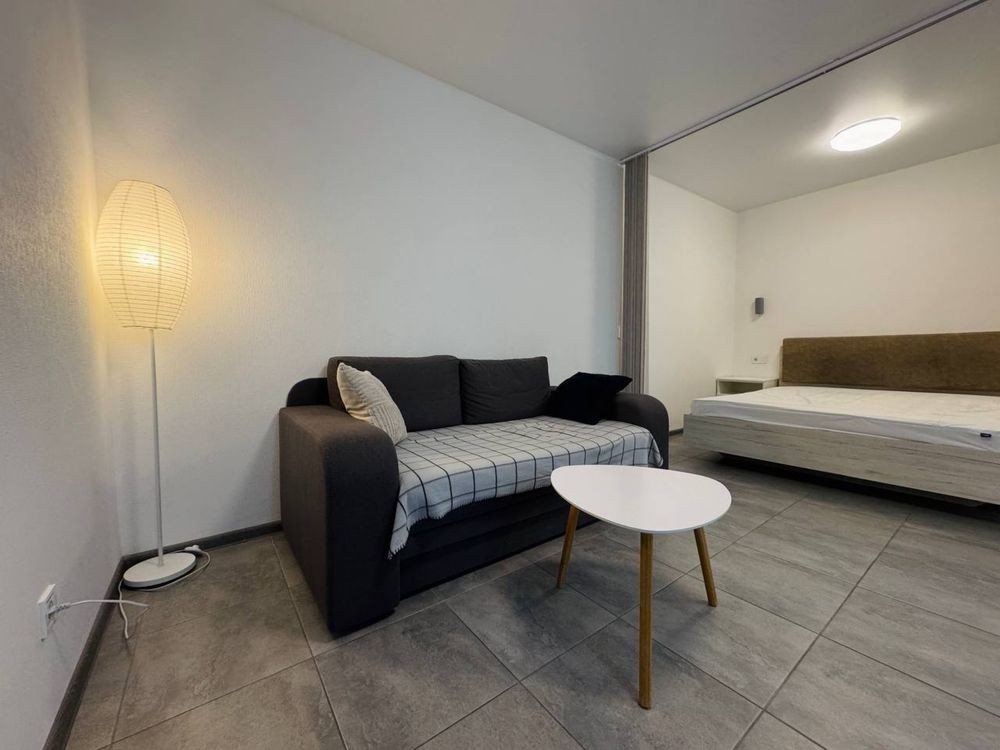 Планировка: кухня-студия, кровать в нише, с/у.
