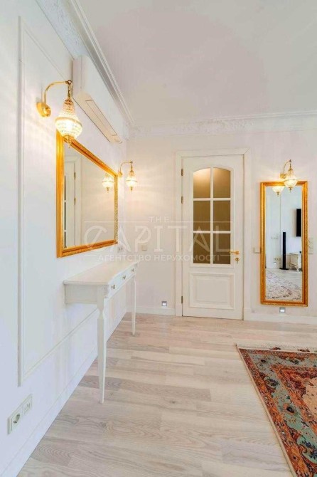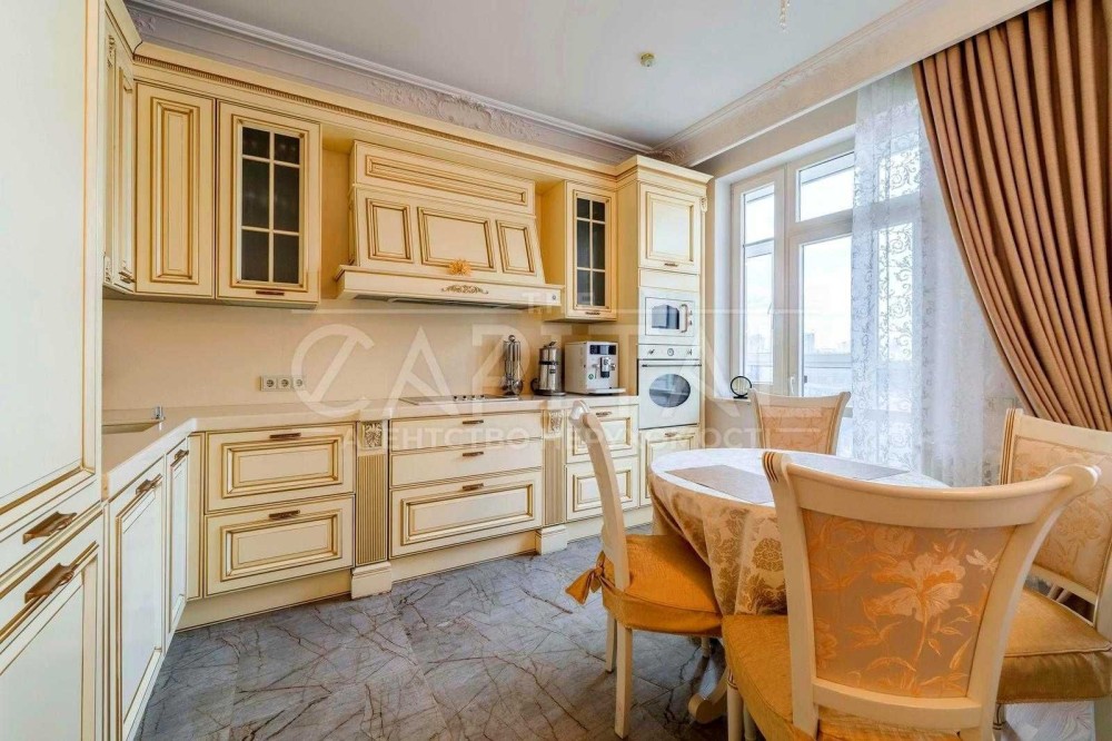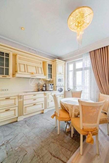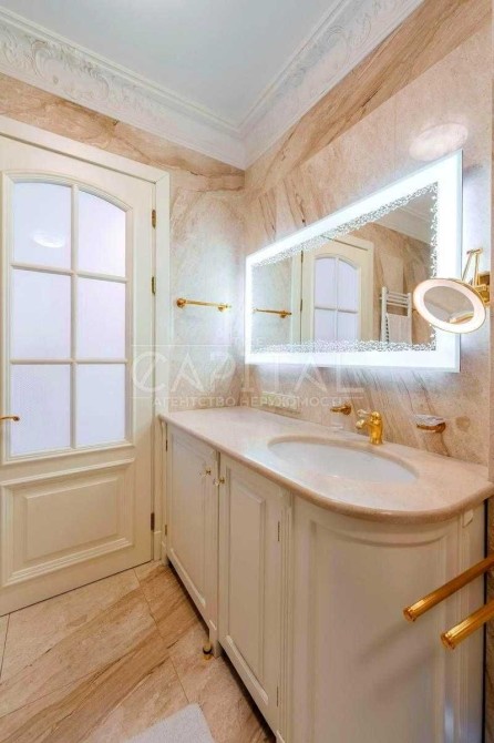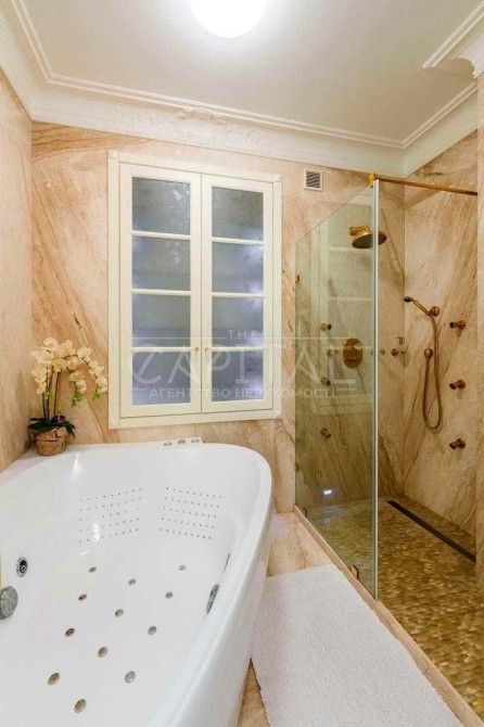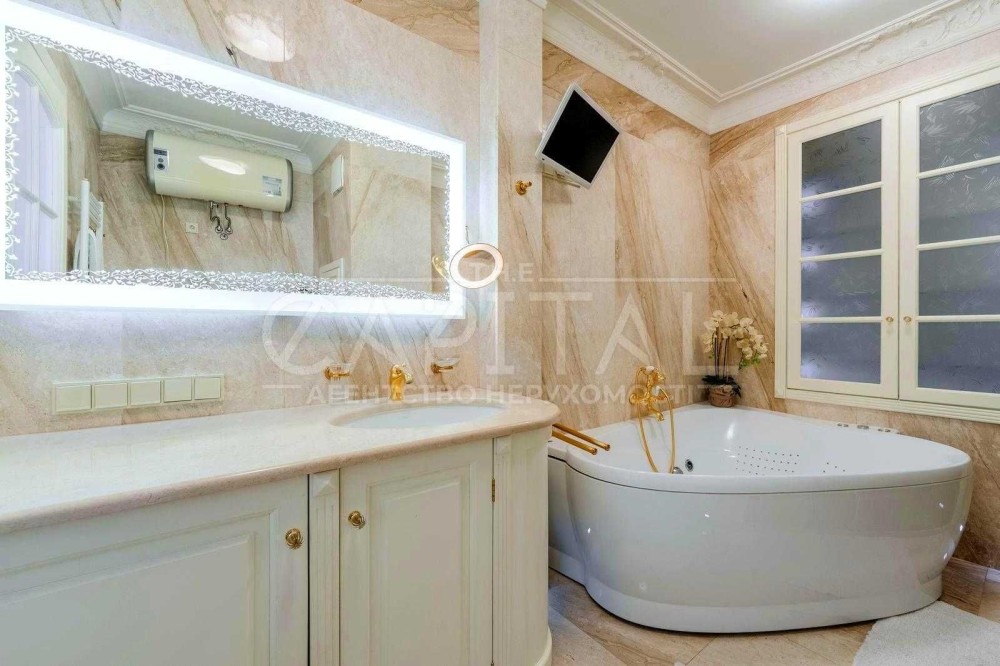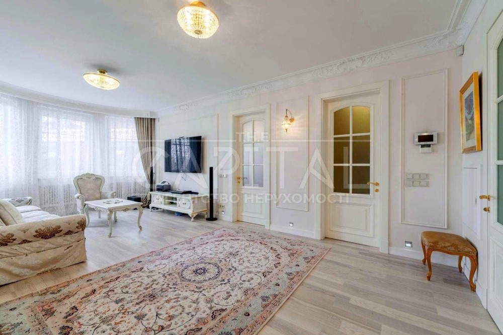 Виконаний дорогий дизайнерський ремонт у класичному стилі з використанням якісних матеріалів із каменю та натурального дерева.