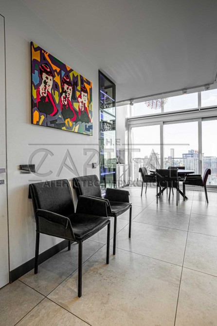 Панорамні вікна, що простягаються на вражаючі 6 метрів у висоту, занурюючи вас у захоплюючий вид на центр Києва.