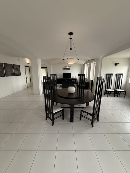 — авторская классика: кожаные диваны, дизайнерский обеденный стол