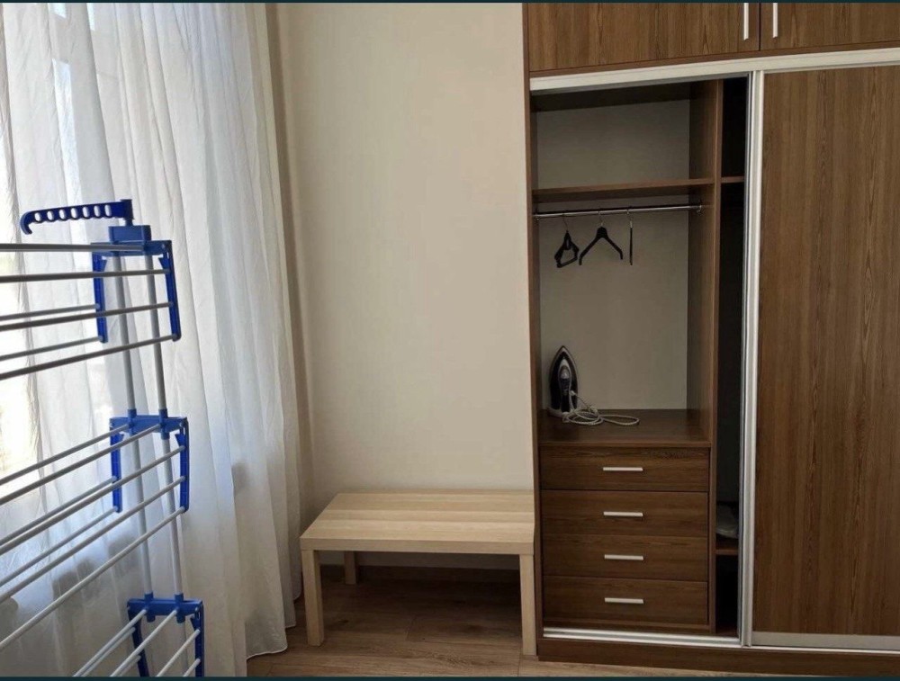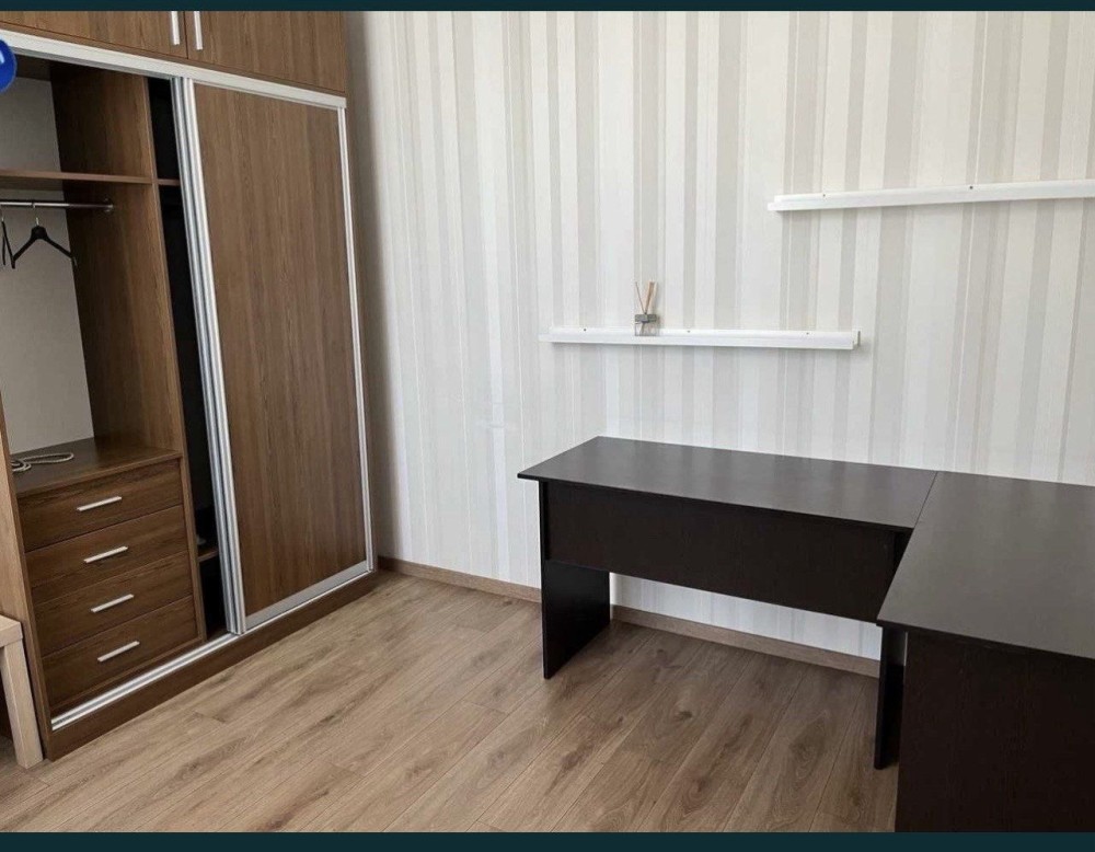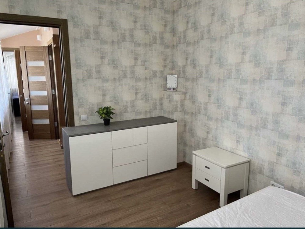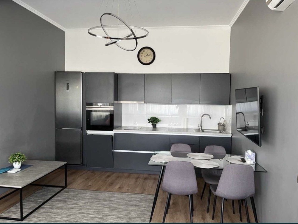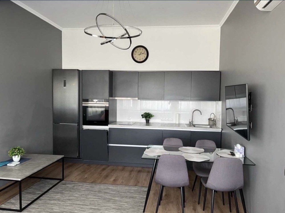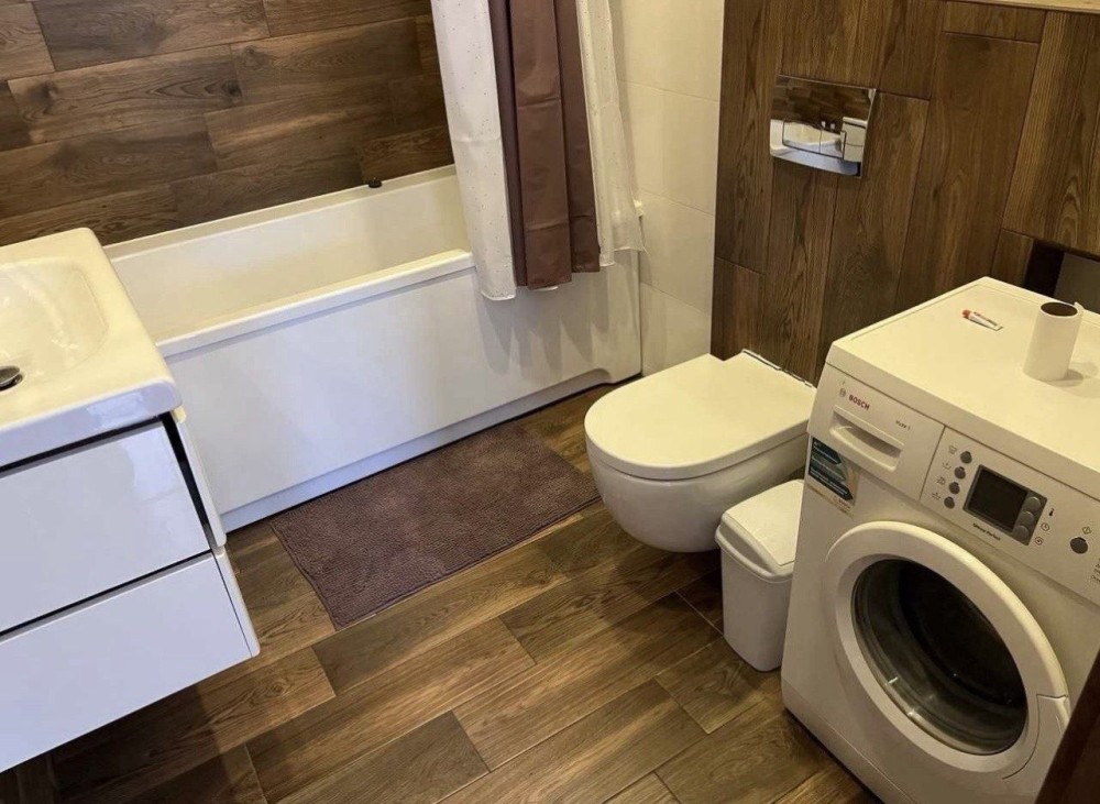 2 электрокомфорки, пасудомойка, стиральная машинка, бойлер, вытяжка, 2 санузла (один с ванной, другой как гостевой), гардеробная отдельная, 2 раздельные комнаты (одна спальня, в другой стоит шкаф и стол, но его можно перенести и сделать спальню или детскую, и кухня-гостиная с обеденной зоной и зоной отдых с телевизором, подогрев пола в санузле. Потолки высокие, по периметру квартиры множество окон. Квартира очень светлая. Крышная котельная своя.
