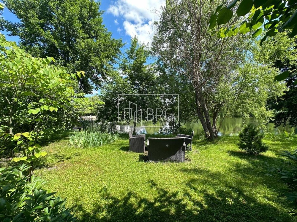 Ландшафтный дизайн, плодовый сад, зона барбекю, очаг, мебель у озера