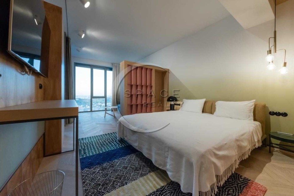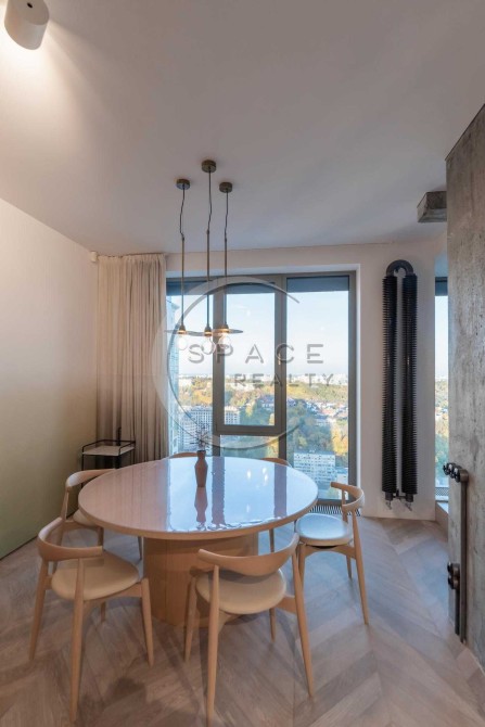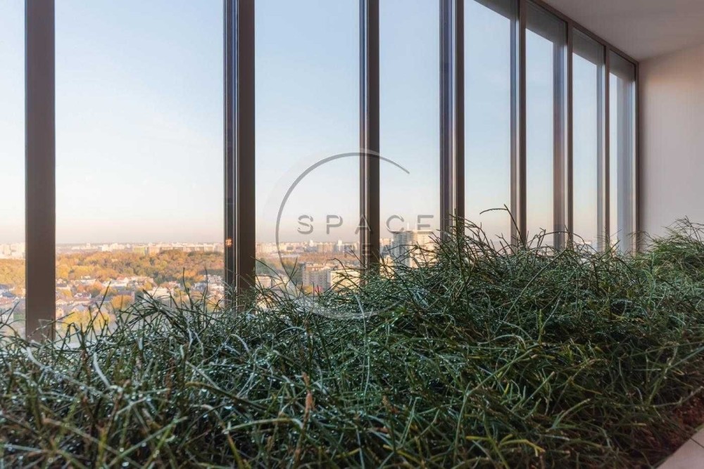 Квартира розташована на видовому поверсі, з панорамними вікнами від підлоги до стелі, що відкривають приголомшливі краєвиди на місто.