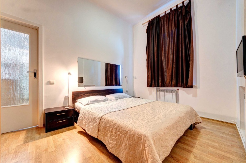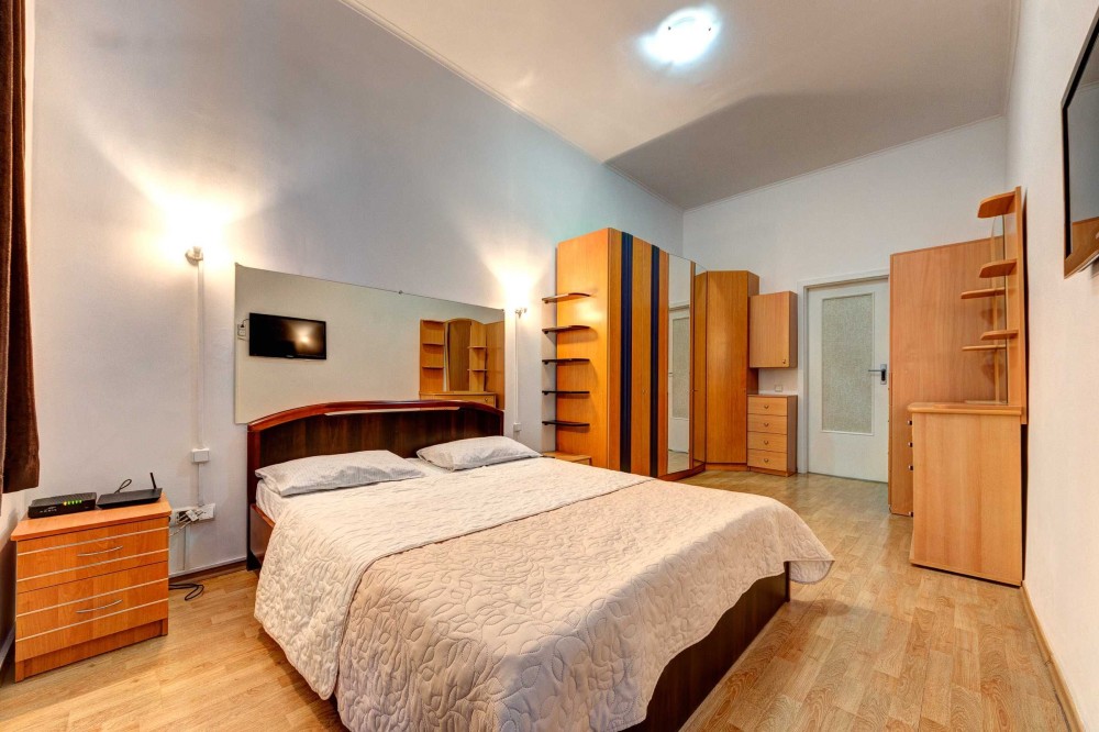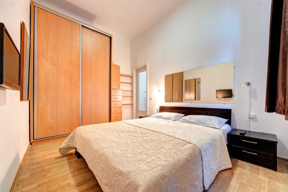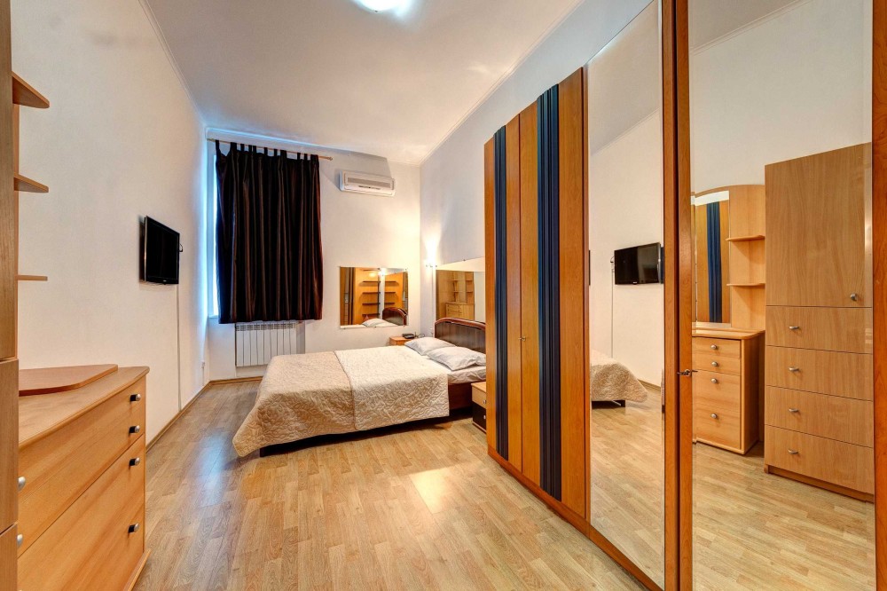 Вторая спальня вмещает в себе так же все что необходимо для комфортного отдыха: двуспальная кровать, две тумбочки, в одной двустворчатый шкаф-купе, зеркало и телевизор. В квартире предоставлен кондиционер и WI-FI.