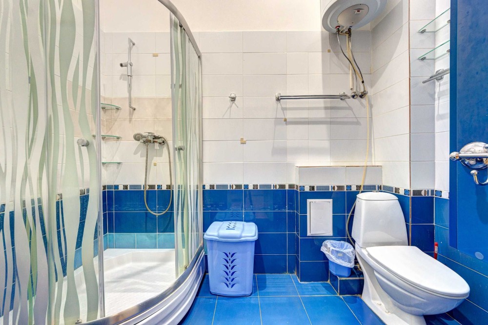 Ванная комната совмещена с уборной, в бело-синих цветах. Внутри разместились: душевая кабина, умывальник с зеркалом и бойлер.