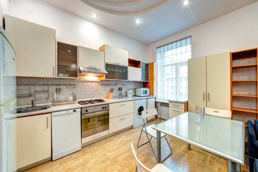 Здесь также расположен выход на балкон. В кухонной зоне размещен мебельный гарнитур с рабочей поверхностью, обеденный стол со стульями и шкаф. Для комфортного проживания предоставлена следующая бытовая техника: газовая плита с духовым шкафом, посудомоечная машина, стиральная машина, микроволновая печь, электрический чайник и холодильник.
