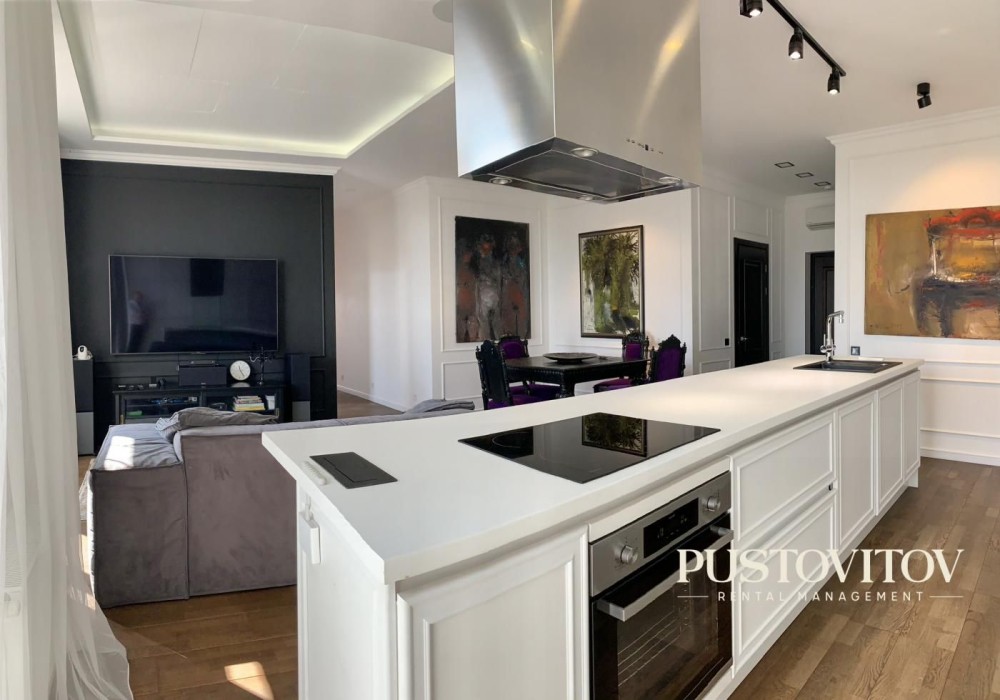 -Из техники: посудомоечная, холодильник плюс отдельно морозильная камера, индукционная плита, духовка, кофеварка, ледогенератор, микроволновка, встроенный измельчитель бытового мусора, система очистки воды.
