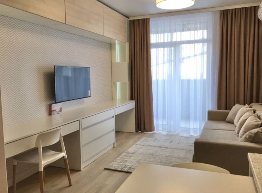 Є вся необхідна меблі та техніка: кондиціонер, смарт-ТВ, посудомийна машина, пральна машина, розкладний диван. Великий балкон (тераса), вікна у двір.