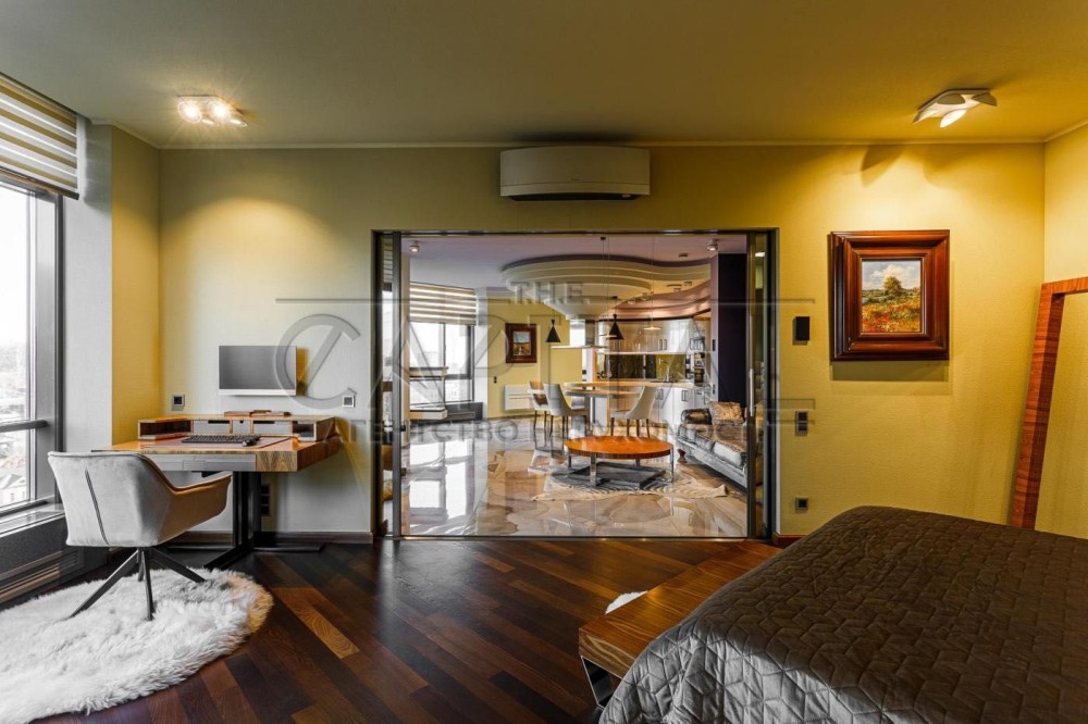 Система розсувних внутрішніх склопакетів забезпечує можливість відділення спальні та кабінету в окремі зони з функцією повної звукоізоляції або органічне їх з'єднання в єдиний простір із вітальнею та їдальнею.