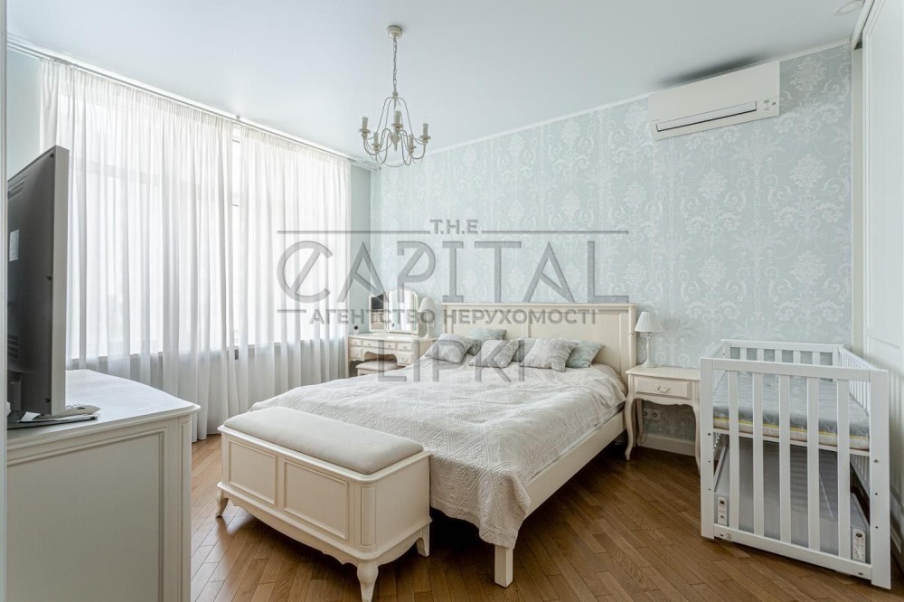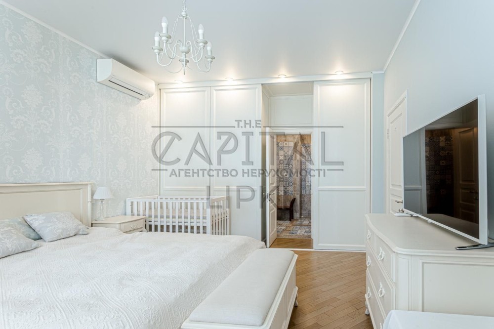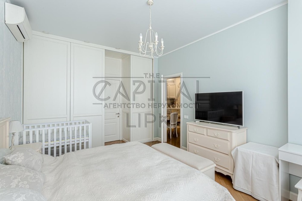 - Меблі: сучасні якісні меблі в світлих тонах, велике ліжко 200х220 з англійським матрацом, тумби, комод, туалетний столик та шафа-купе для зберігання речей. Додатково встановлене дитяче ліжечко.