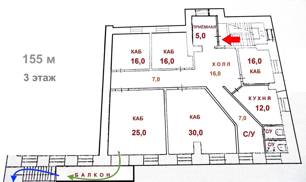 5 отдельных кабинетов, приёмная холл, кухня, терраса, 2 с/узла