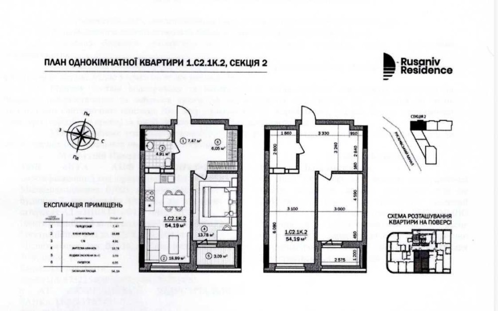 Продається 1-кімнатна квартира в ЖК бізнес-класу Rusaniv Residence який розташований в Дніпровському районі Києва по вулиці Євгена Сверстюка 54. Загальна площа квартир 54 кв.м. Розташована на 15-му поверсі 25-ти поверхового будинку. Висота стелі 2,7 метри. Квартира знаходиться в 2-й секції. З квартири відкривається шикарний панорамний вид на Русанівський канал.