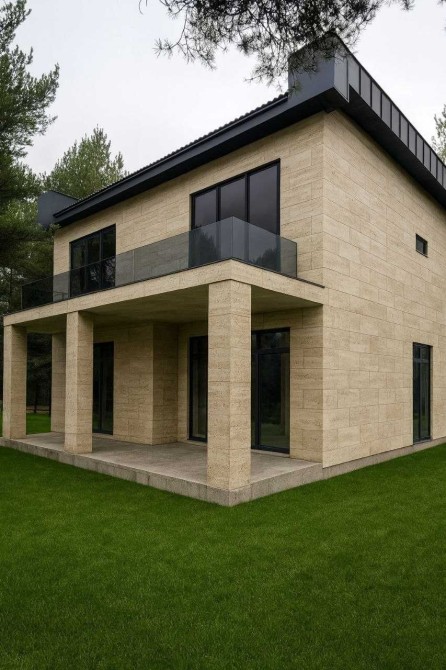 Будинок побудований із якісних матеріалів. Стіни з газоблоку 300 мм, утеплення пінопластом 100 мм. Перекриття — монолітна плита, фундамент монолітно-стрічковий з плитою. Фасад оздоблений натуральним каменем травертин, що надає будинку стильного та дорогого вигляду. Покрівля односкатна з металочерепиці, утеплена мінеральною ватою 200 мм. По всьому будинку встановлені якісні вікна REHAU.