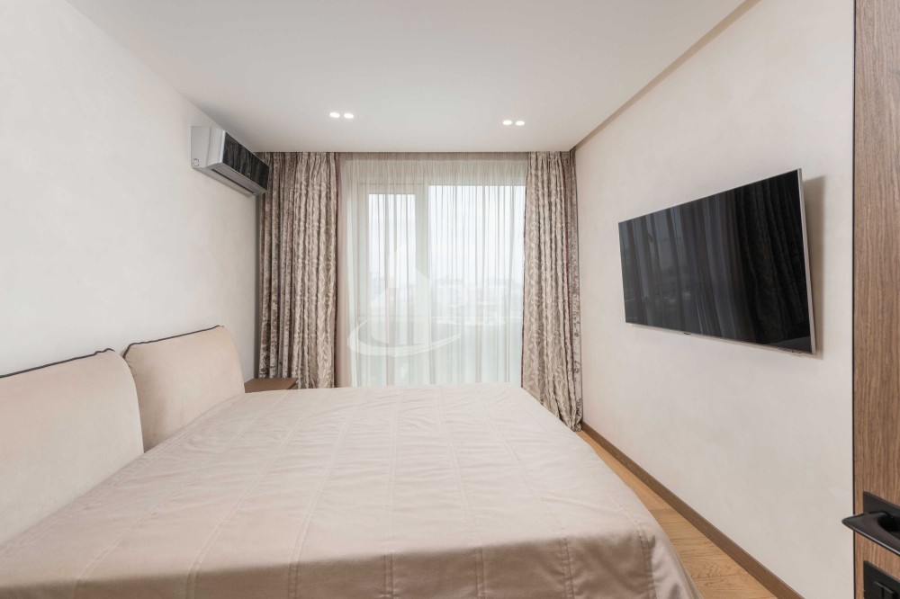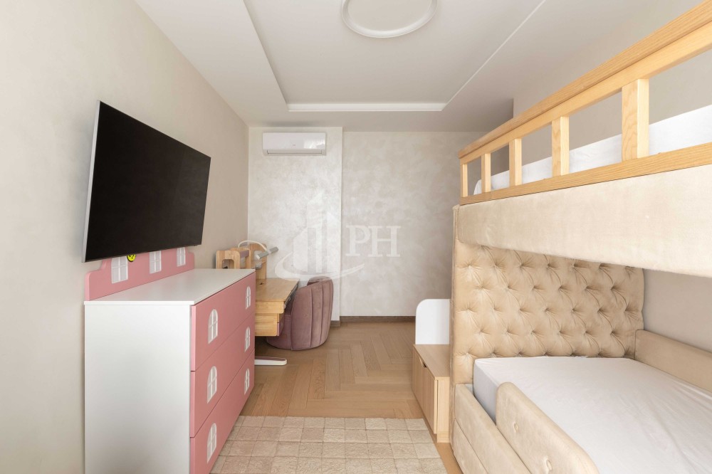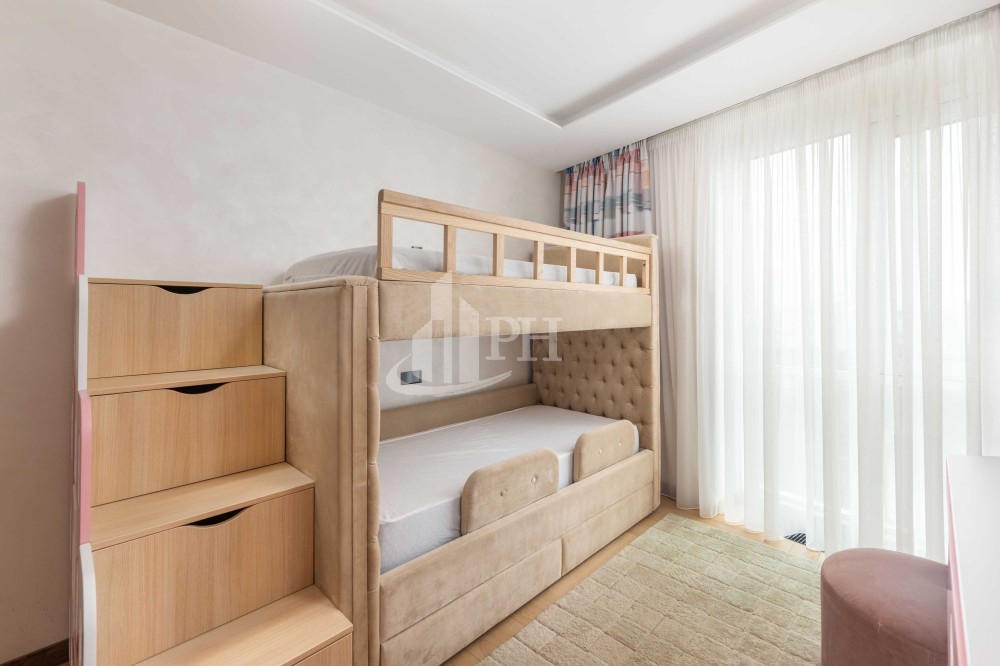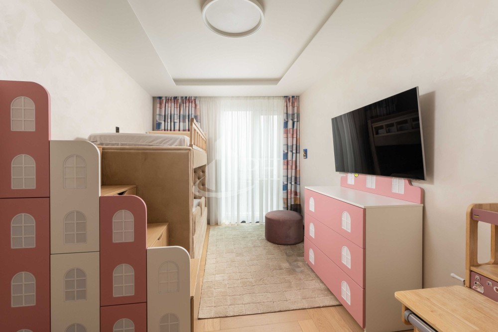 Майстер-спальня укомплектована ліжком, тумбами та OLED-телевізором Samsung. Підлогове покриття — паркет. Дитяча кімната укомплектована двоярусним ліжком, робочою зоною, комодом, телевізором та кондиціонером. Підлогове покриття — паркет. Кухня повністю обладнана побутовою технікою Siemens: духова шафа, мікрохвильова піч, посудомийна машина, варильна поверхня, холодильник. В обідній зоні — розкладний стіл та 6 стільців. У вітальні — великий модульний диван та великий OLED-телевізор. З вітальні відкривається вражаючий панорамний вид на Київ. Балкон має безрамне скління та електрокарниз. Одна ванна кімната — з душем та пральною і сушильною машинами бренду Miele, інша — з ванною. Також у квартирі дві гардеробні.