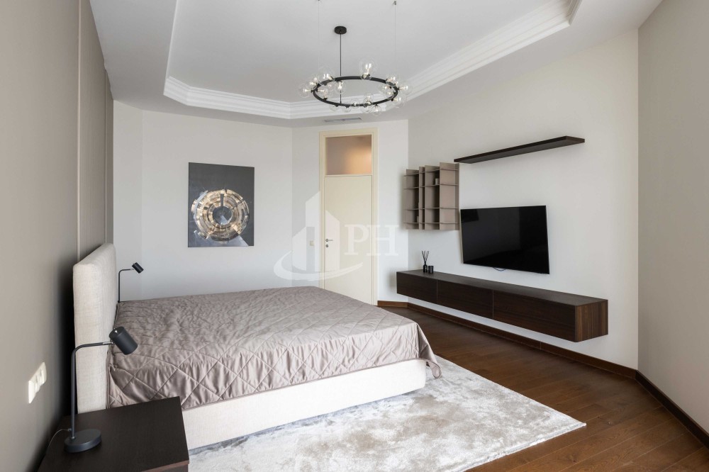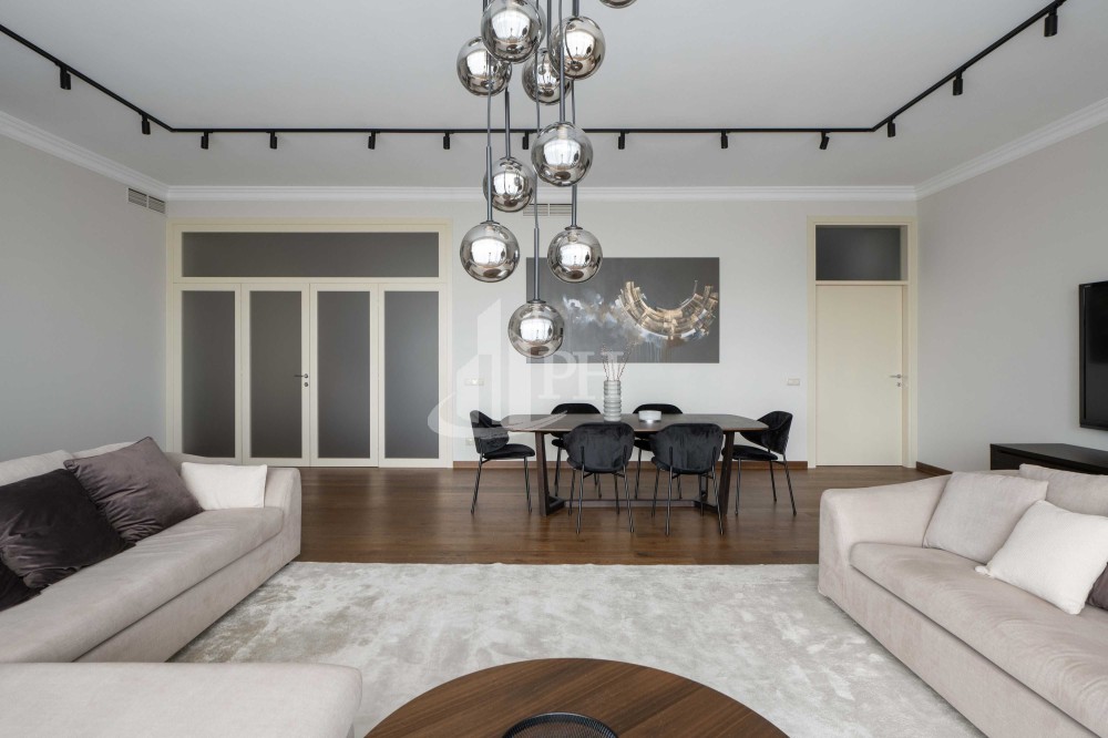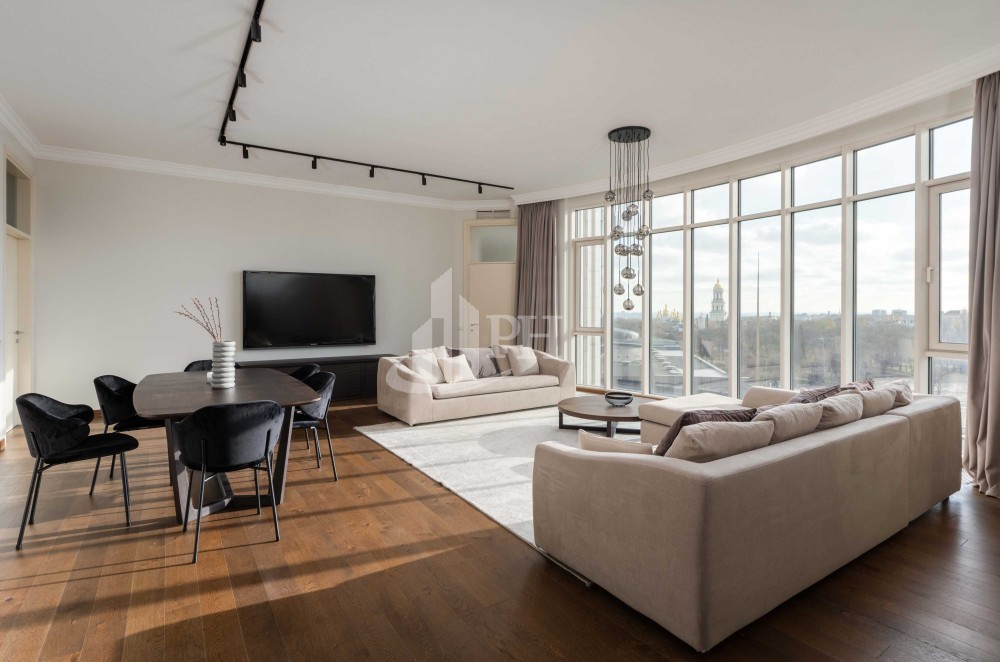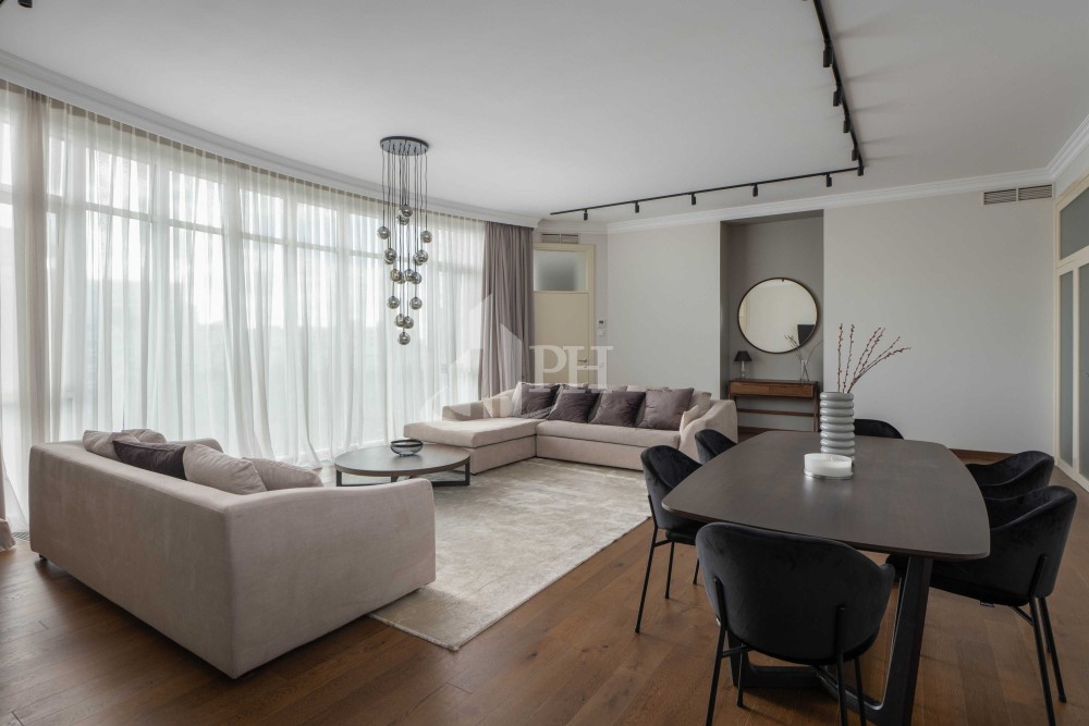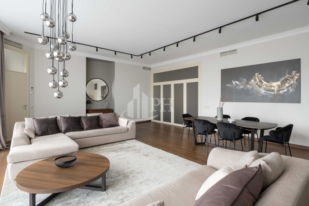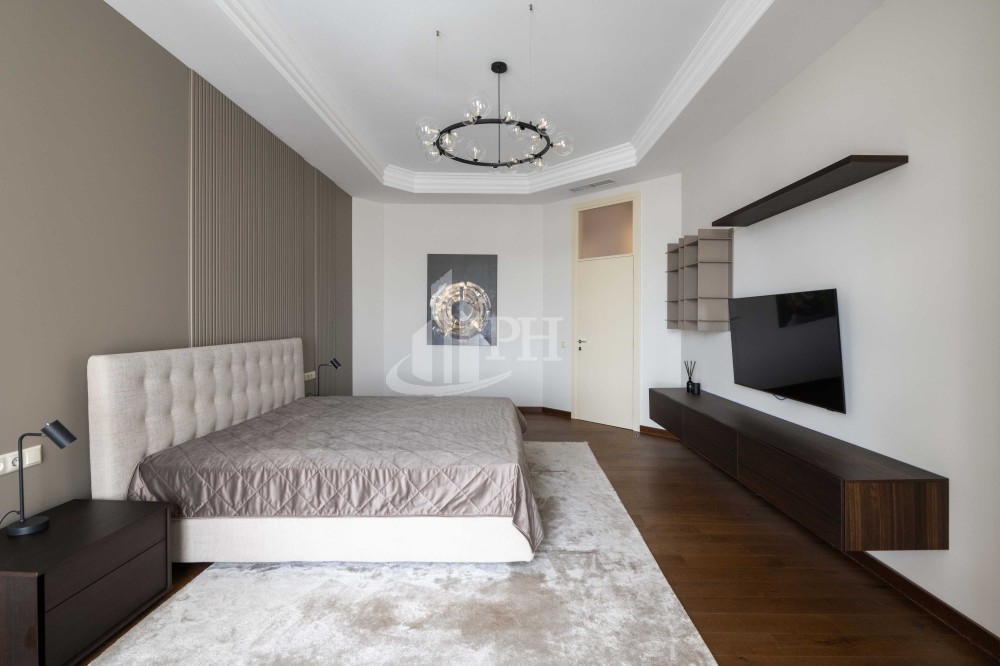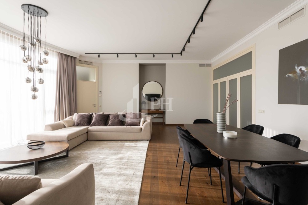 У квартирі зроблено ремонт за авторським проектом з використанням екологічно чистих матеріалів та якісної побутової техніки. В квартирі: вітальня, обідня зона, дві спальні, що мають власні гардеробні та ванні кімнати, гостьова вбиральня, гардеробна, пральня.