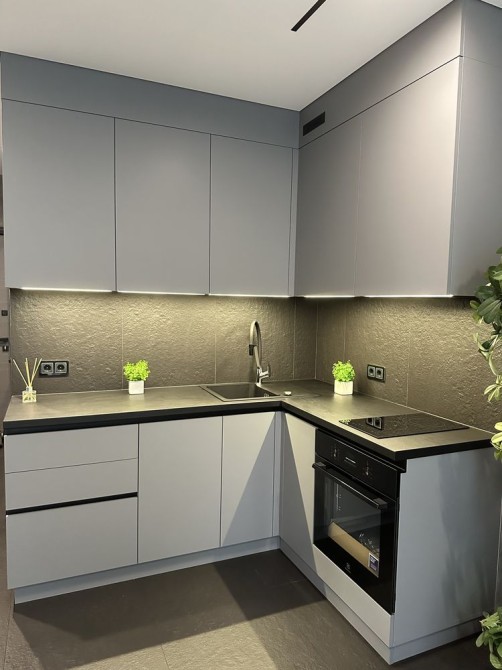 Кухня має вбудовану індукційну плиту, духову шафу та витяжку.