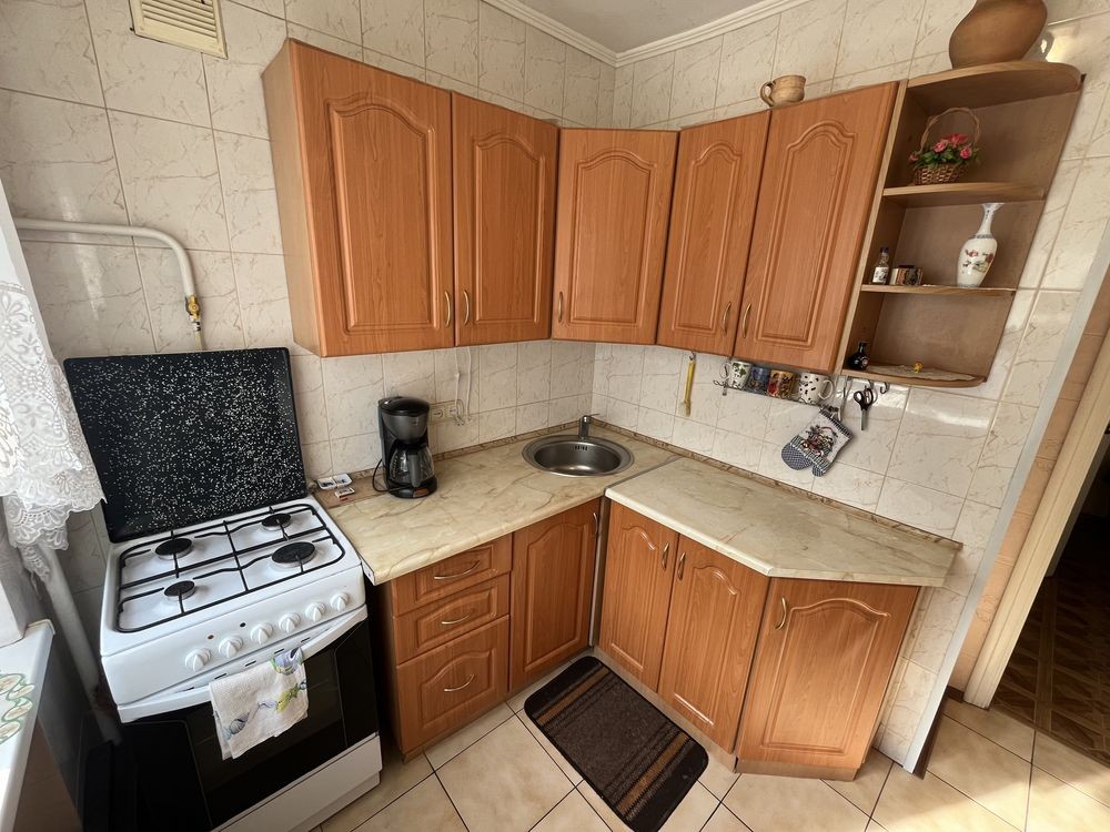 Кухня вбудована, газова плита з духовкою, двокамерний холодильник, посуд.