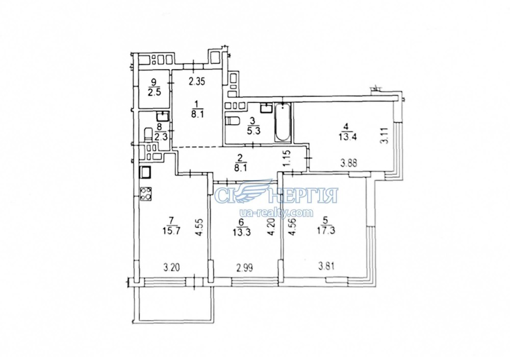 Квартира загальгою площею 90,6 м.кв., житловою 44 м.кв. і кухнею 15.7 м.кв. розташована на 8-му поверсі і має чудове планування: три кімнати 17,3 м.кв., 13,4 м.кв., 13,3 м.кв., велика кухня майже 16 м.кв. з балконом, 2 санвузли, гардеробна та зручний передпокій.