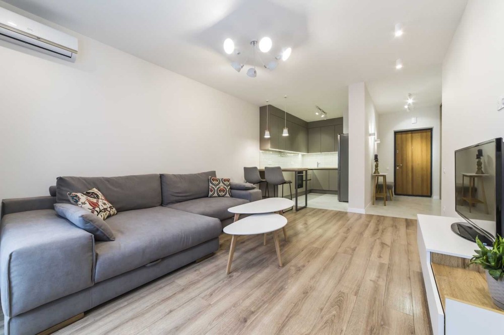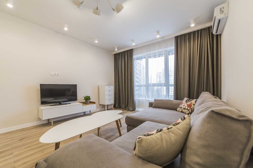 Світлі тони, натуральні текстури, акцентне освітлення - створюють атмосферу спокою. Повністю укомплектована технікою (індукційна плита, духова шафа, мікрохвильова піч, холодильник, бойлер, пральна машина, підігрів підлоги у санвузлі, лічільник на все). Зручна барна стійка. Комфортний розкладний диван, кондиціонер та великі вікна, що наповнюють простір світлом.