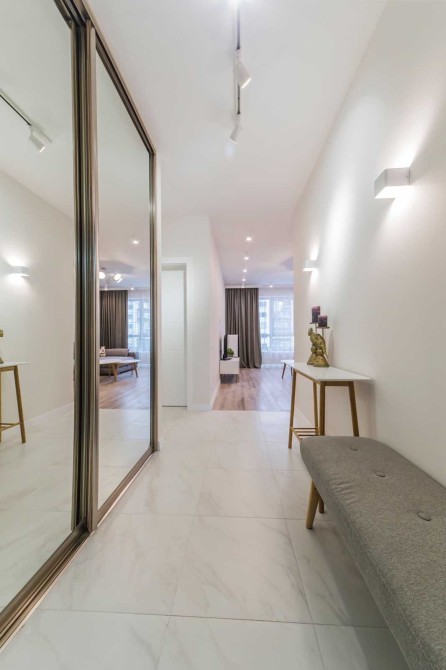 Велика дзеркальна шафа-купе у прихожій, що візуально розширює простір.