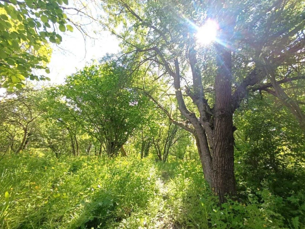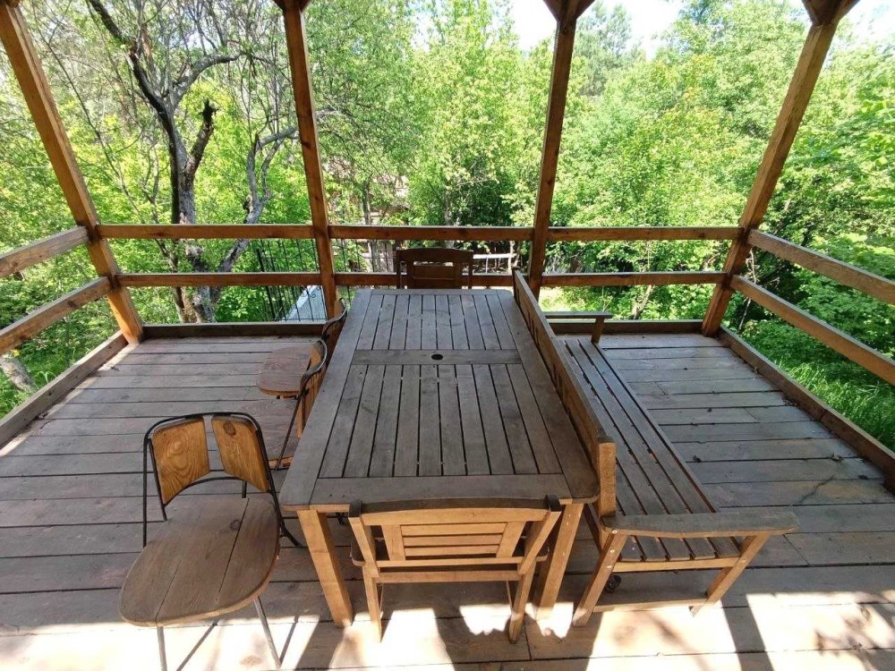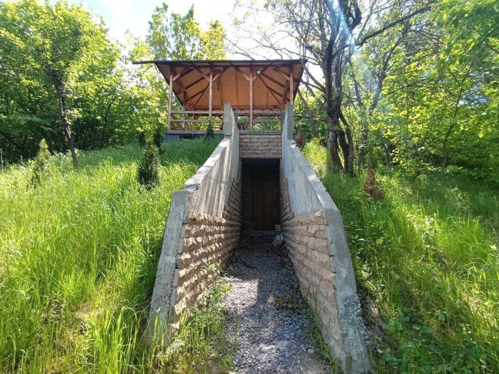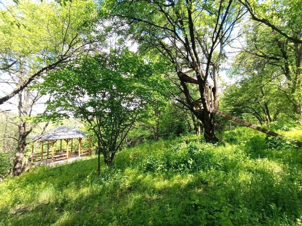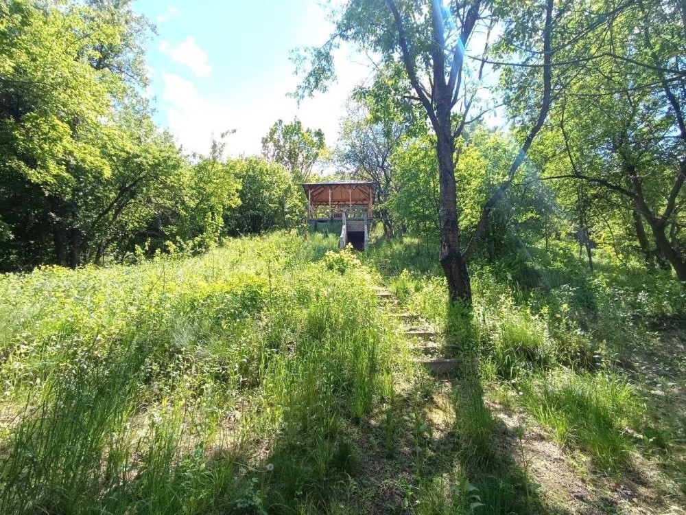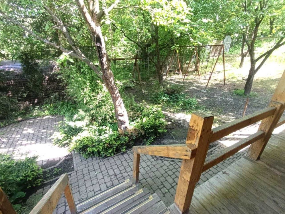 ділянка доглянута та огороджена із освітленням, охоронною сигналізацією та відеонаглядом, огорожа — металева та сітка, асфальтований під’їзд, є навіс для авто, на території підсобні приміщення, комора, літній душ, ігровий майданчик, навіс для зберігання дров, газон, грядка, декоративні насадження, перед будинком ділянка рівної прямокутної форми, яка плавно переходить в крутий укріплений схил із лісом, на схилі збудована дерев’яна альтанка із меблями та оглядовим майданчиком, у схилі обладнане бетонне бомбосховище,