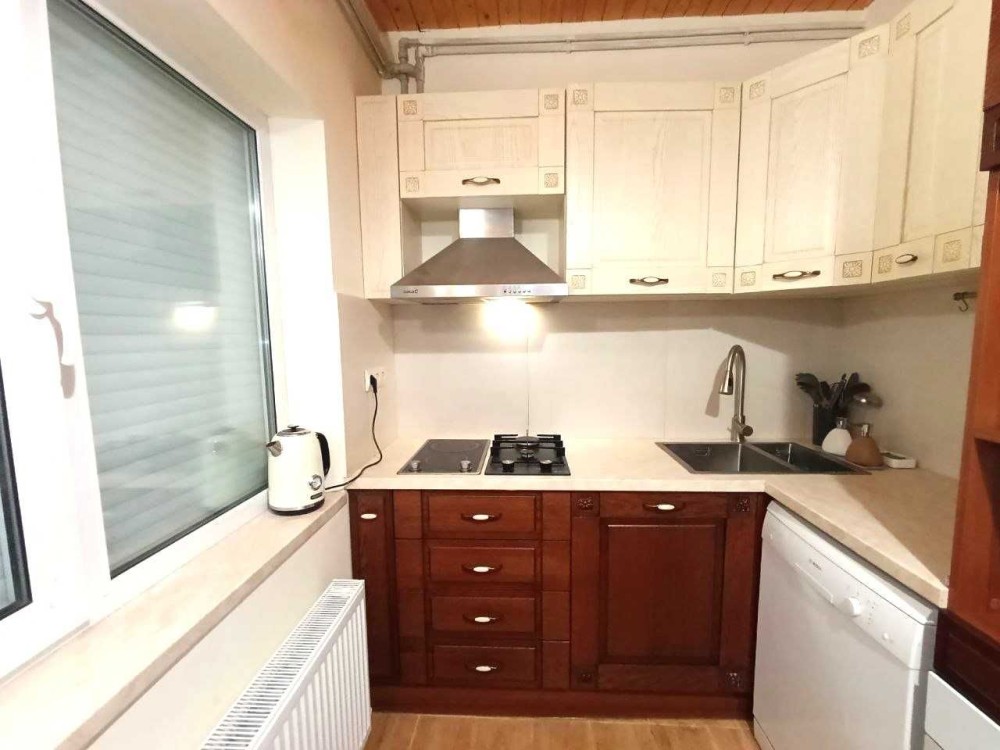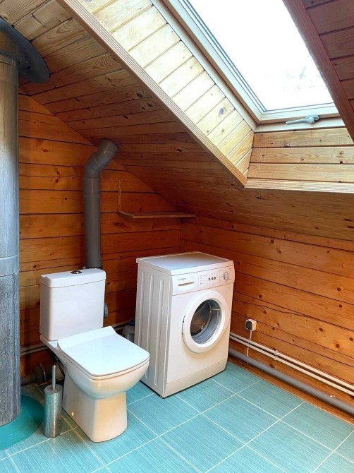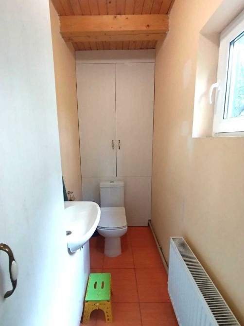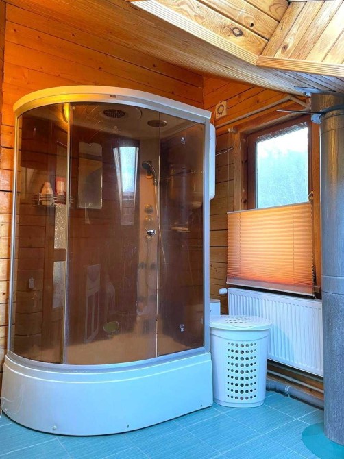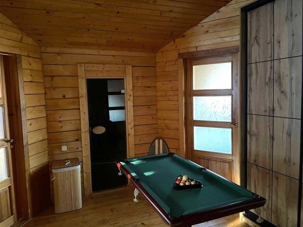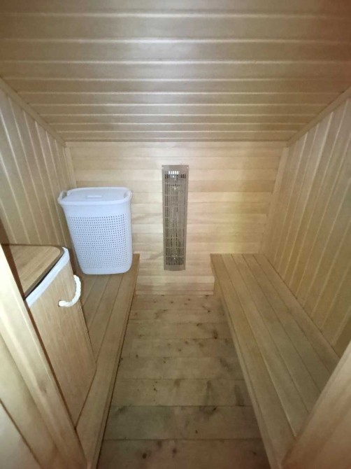 1-й поверх: кухня, столова з каміном, санвузол, господарські приміщення, 2-й поверх — великий санвузол із душовою кабіною, три кімнати, фінська сауна; вбудована італійська кухня, меблі,