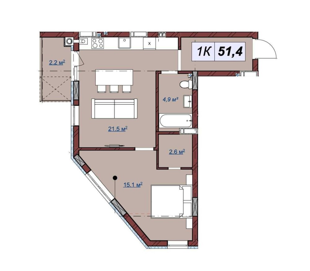 Площа: 51.4 м2.