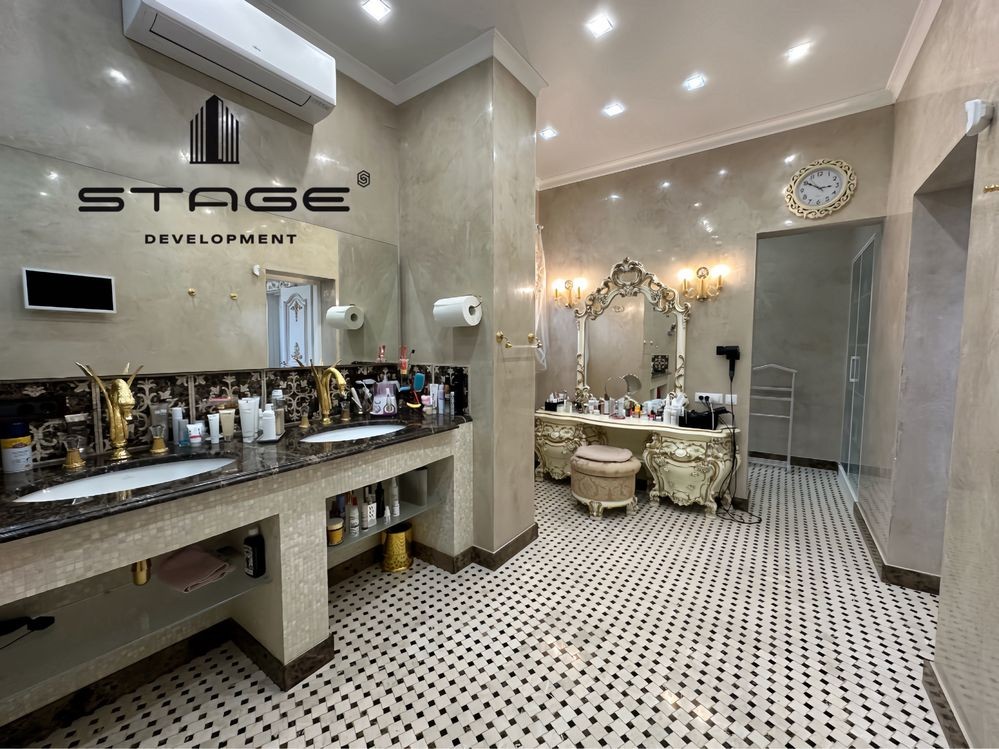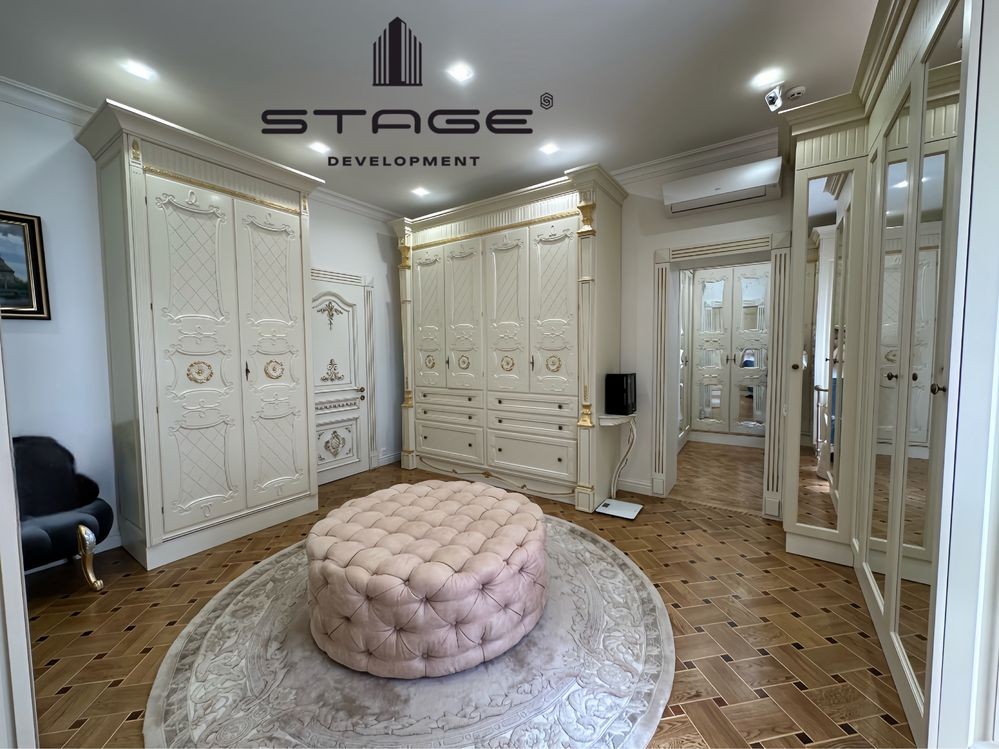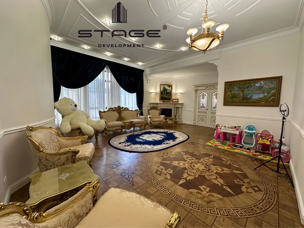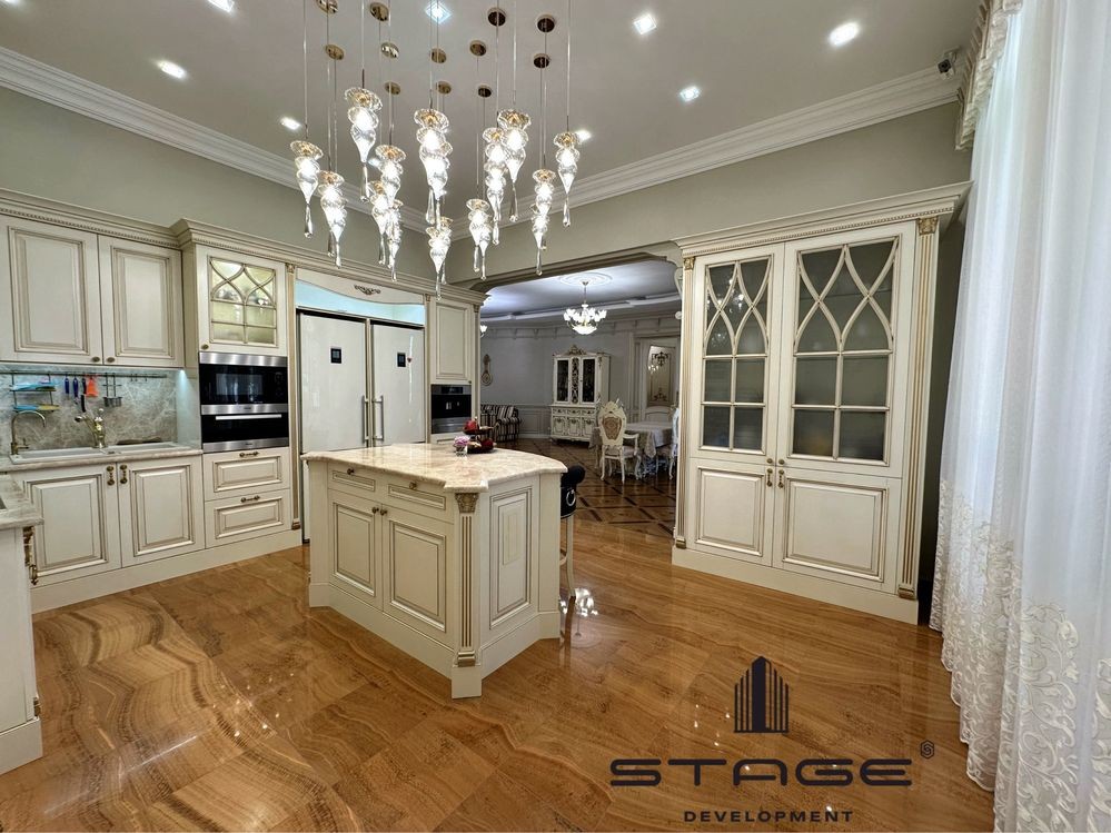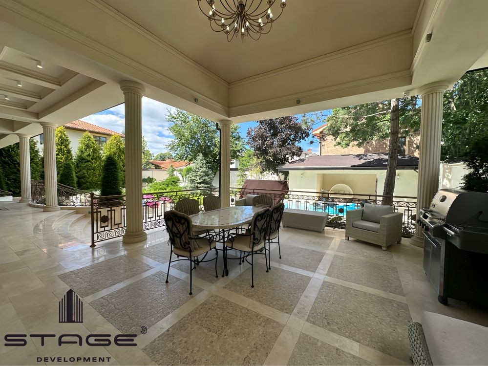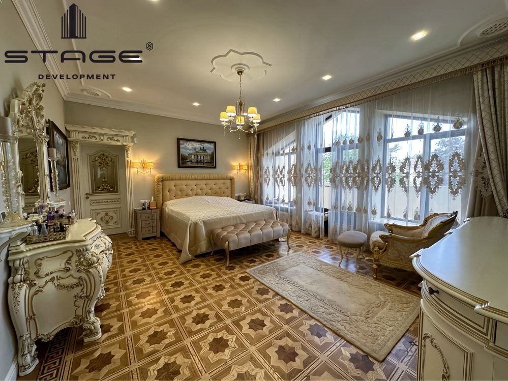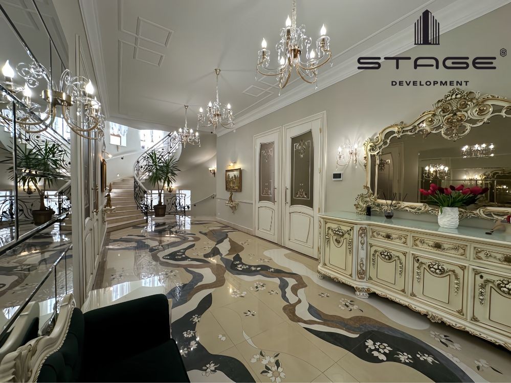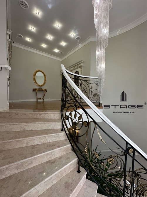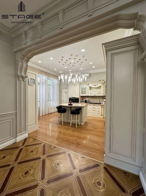 Первый этаж: холл, просторная кухня-гостиная с выходом на террасу, каминный зал, кабинет, гостевая мастер-спальня, гардеробная, кладовая. Гараж на два больших автомобиля с комнатой отдыха и санузлом для водителя и охраны. Второй этаж: три мастер-спальни со своими гардеробными и балконами. Цокольный этаж: спа зона с финской сауной, душ, массажная комната, постирочная, большая комната (оборудована, как бомбоубежище), спальня для персонала, санузел, кладовая. Есть отдельный вход для обслуживающего персонала.