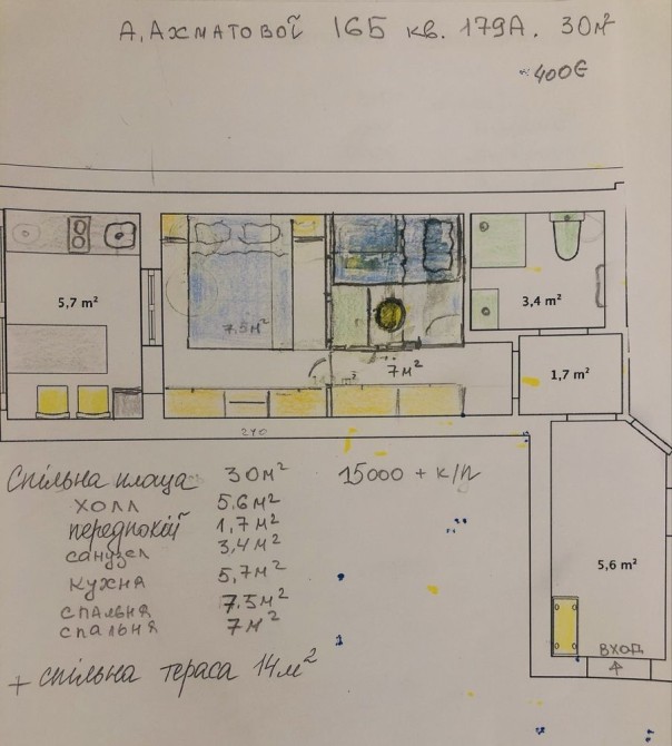 - Площа: 30 м², 13/13 поверх (ліфт до 12-го + 1 проліт сходами).