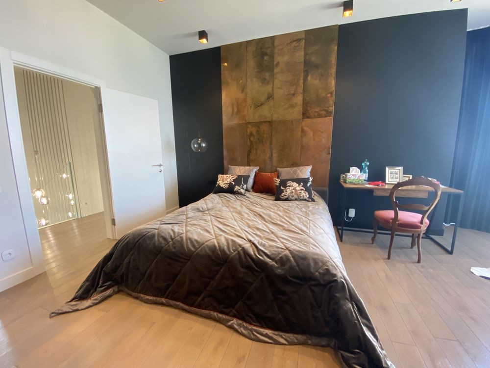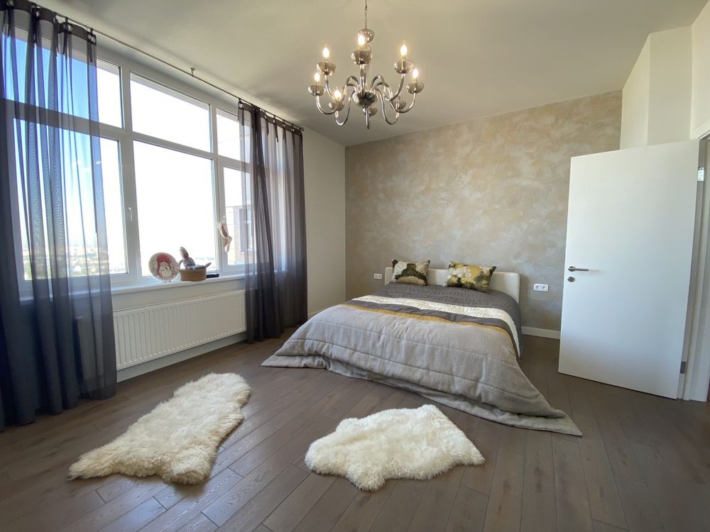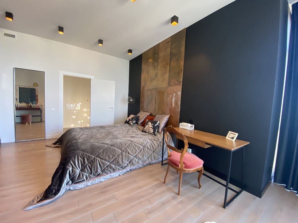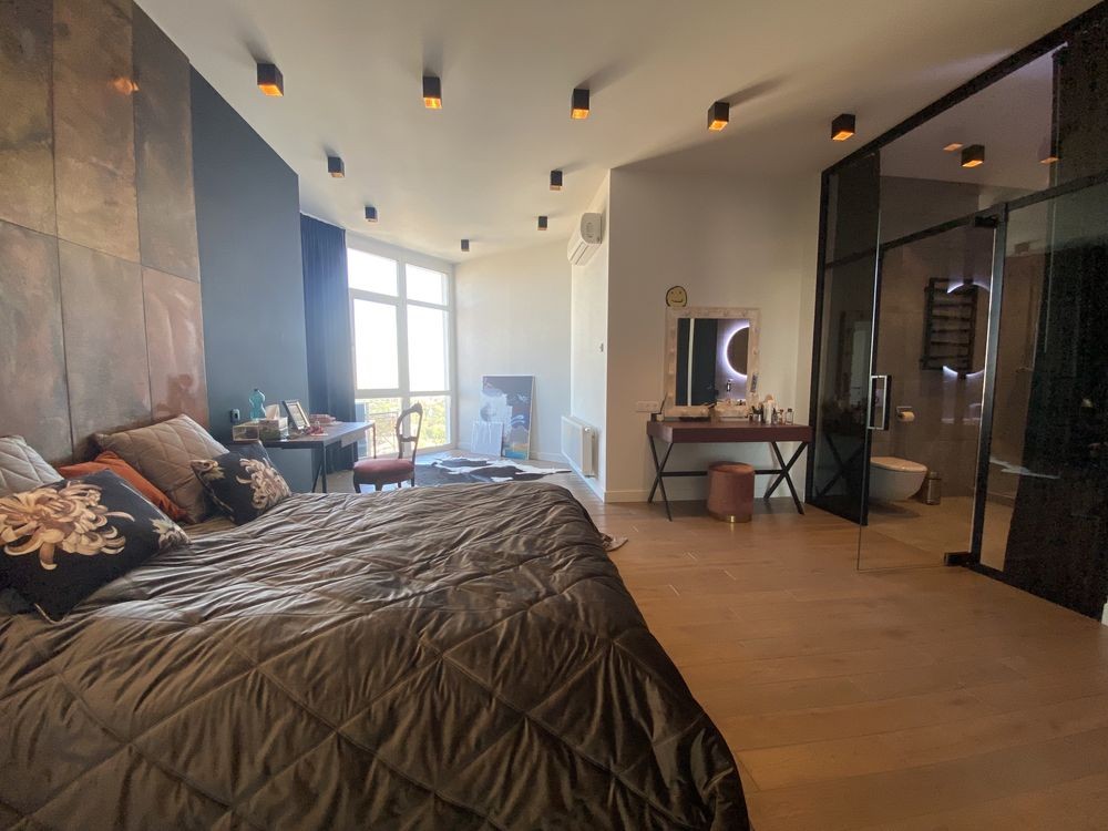 2-й рівень: простора спальна кімната із панорамними вікнами, своїм с/в і гардеробом; спальна кімната із виходом на балкон; кабінет з диваном; гардероб; с/в.