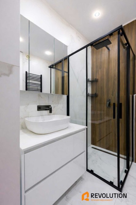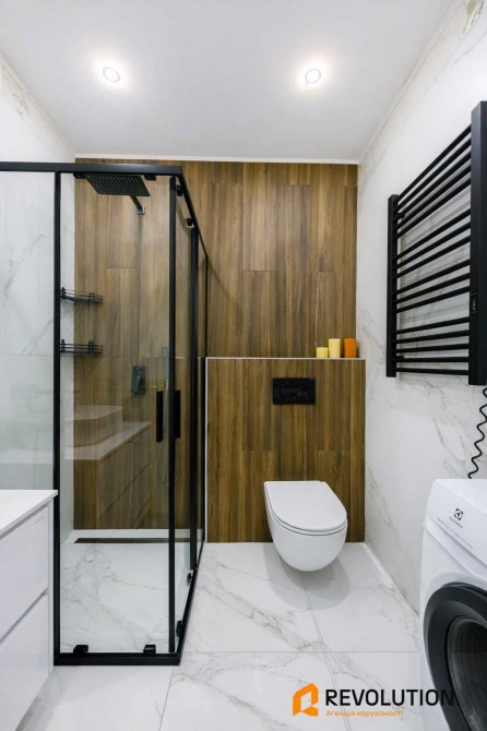 Сучасна ванна кімната — душова кабіна, бойлер та пральна машина.