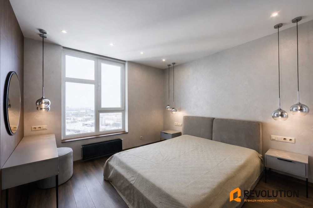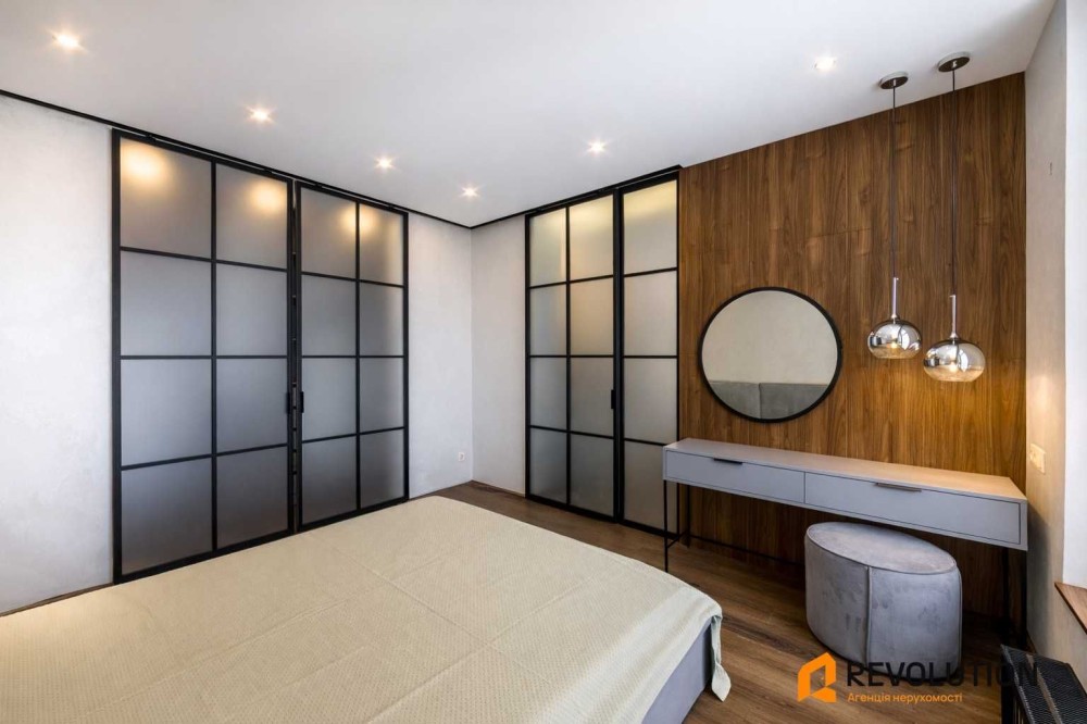 Затишна спальня — ліжко з ортопедичним матрацом, б’юті-зона та просторий гардероб.