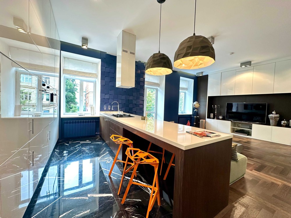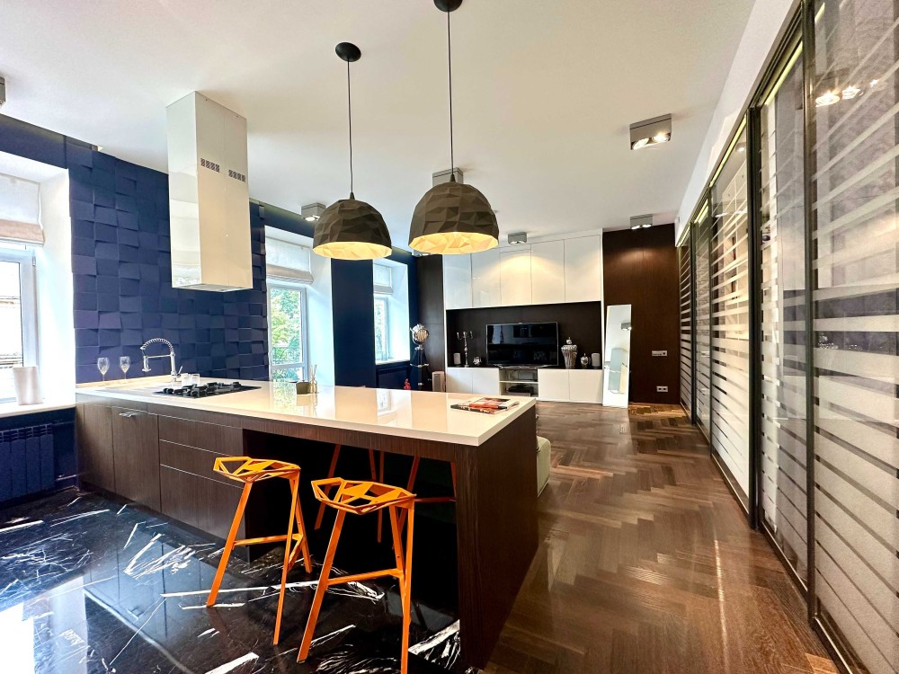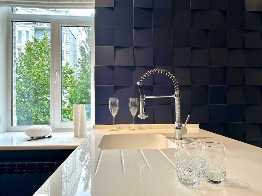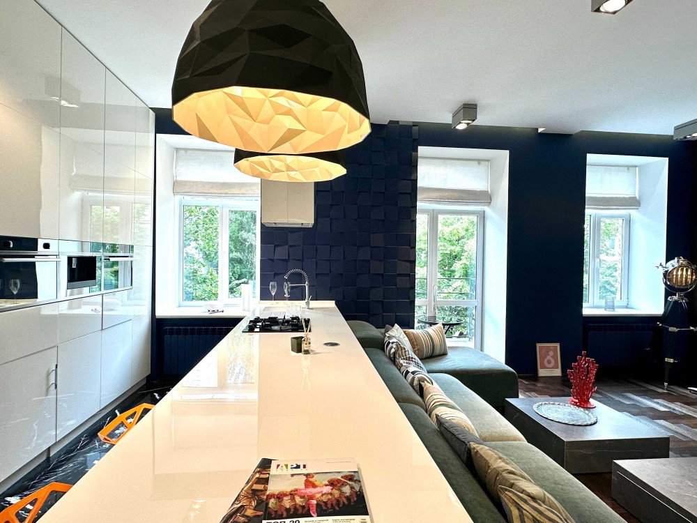 У квартирі зроблено багаторівневе освітлення (Німеччина). Кухня під замовлення і стінові панелі 3D від майстерні Сергія Махно.