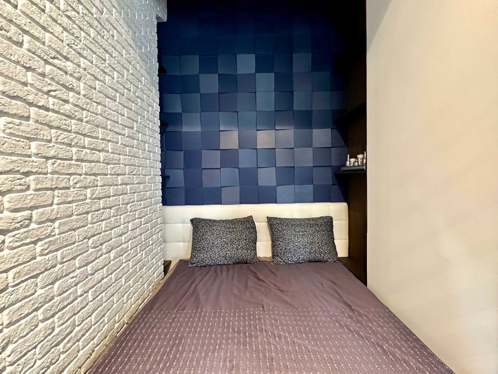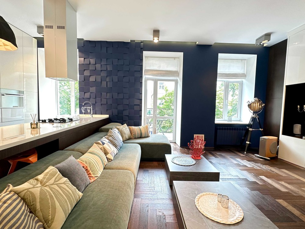 Квартира - студія обʼєднує в один великий простір вітальню, кухню, зоноване спальне місце зі зручним двоспальним ліжком.