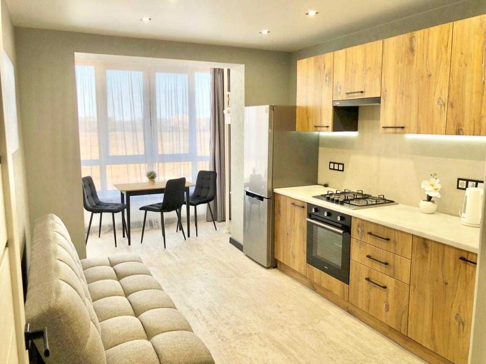 Комфорт: ​Велика кухня-вітальня облаштована зручним диваном, що створює додаткову зону відпочинку або гостьове спальне місце.
