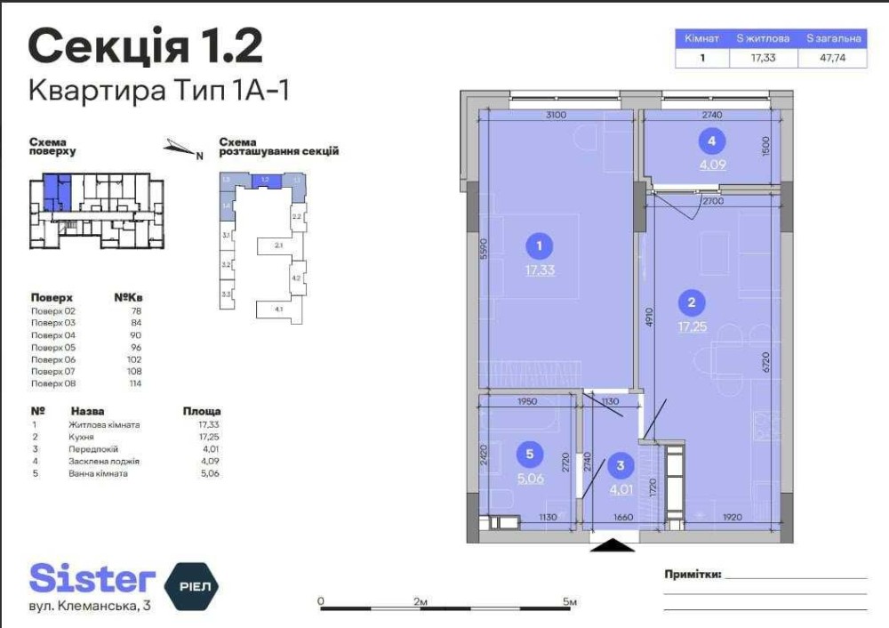Загальна площа - 47,74 м², житлова площа - 17,3 м², площа кухні - 17,3 м². Будинок 1.2, вікна у двір.