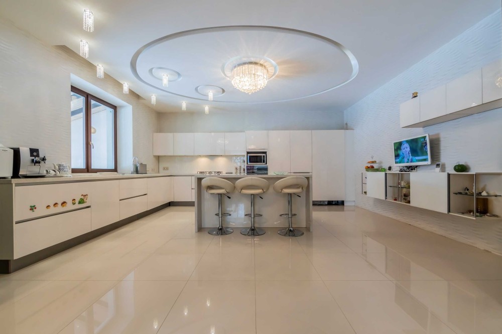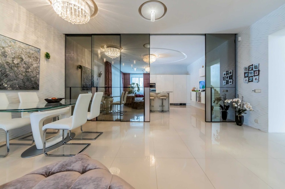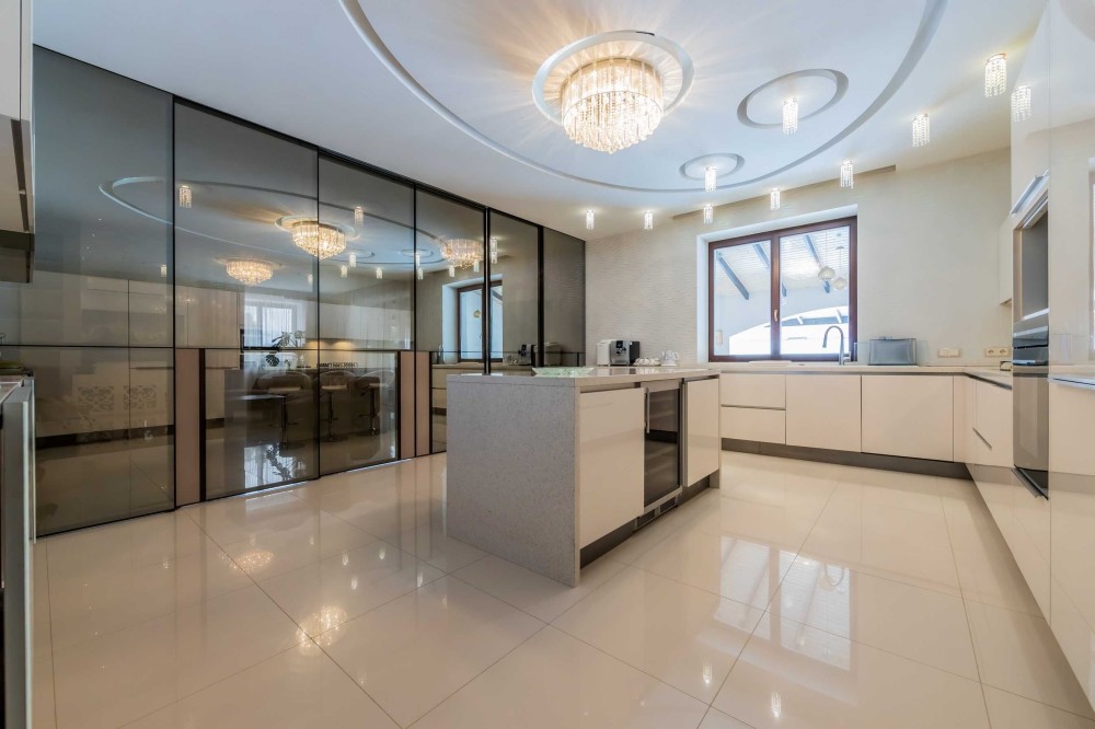 Кухня виготовлена ​​за індивідуальним замовленням фасади та стільниця зі скла Обідній стіл та стільці італійського виробника.