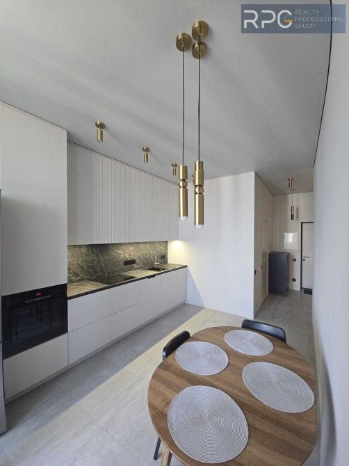 - Кухня-вітальня (17м²): Оснащена сучасною вбудованою кухнею з високоякісною технікою – варильна поверхня, духова шафа, мікрохвильова піч, вбудований холодильник та італійська витяжка.