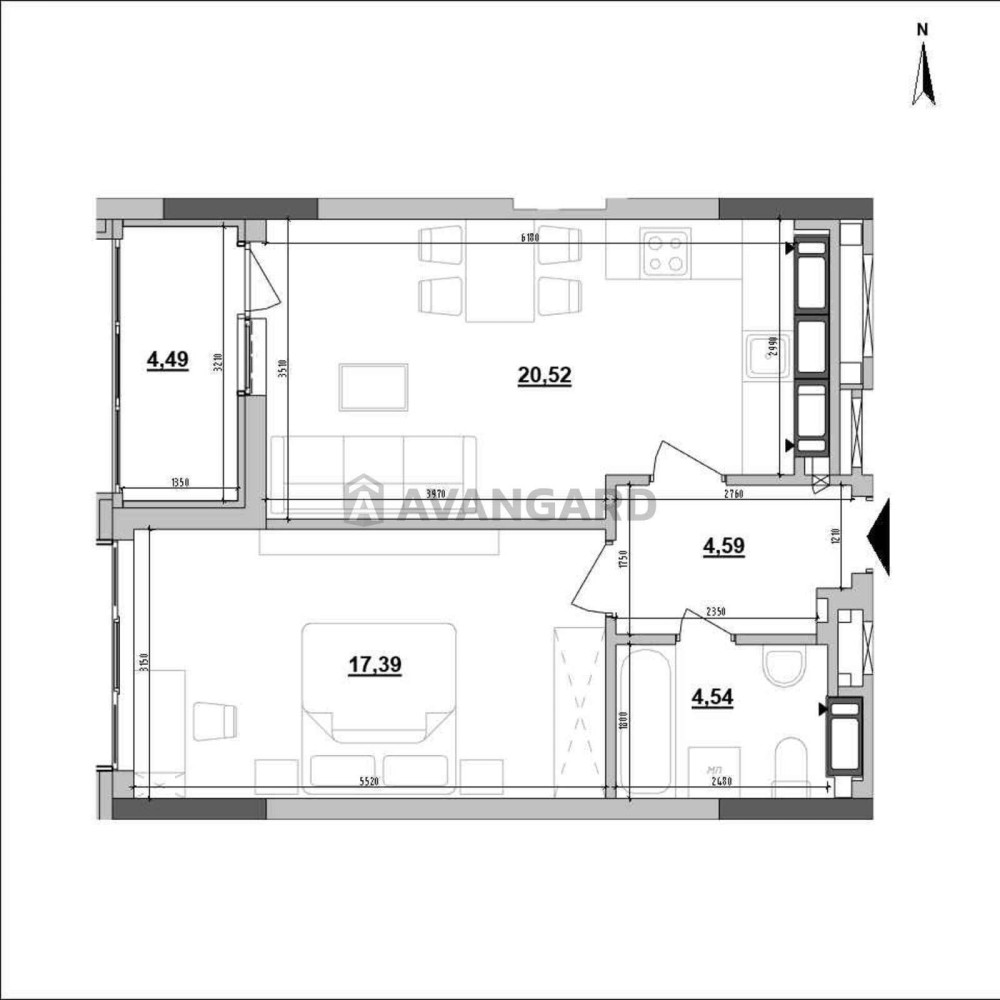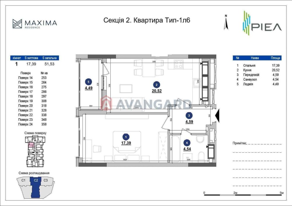 1 кімнатна квартира, 51.53 / 17.39/ 20.52 м2, 21/25, балкон-лоджія, видова квартира. 2 черга, 2 секція, готовність 4 квартал 2026р.
