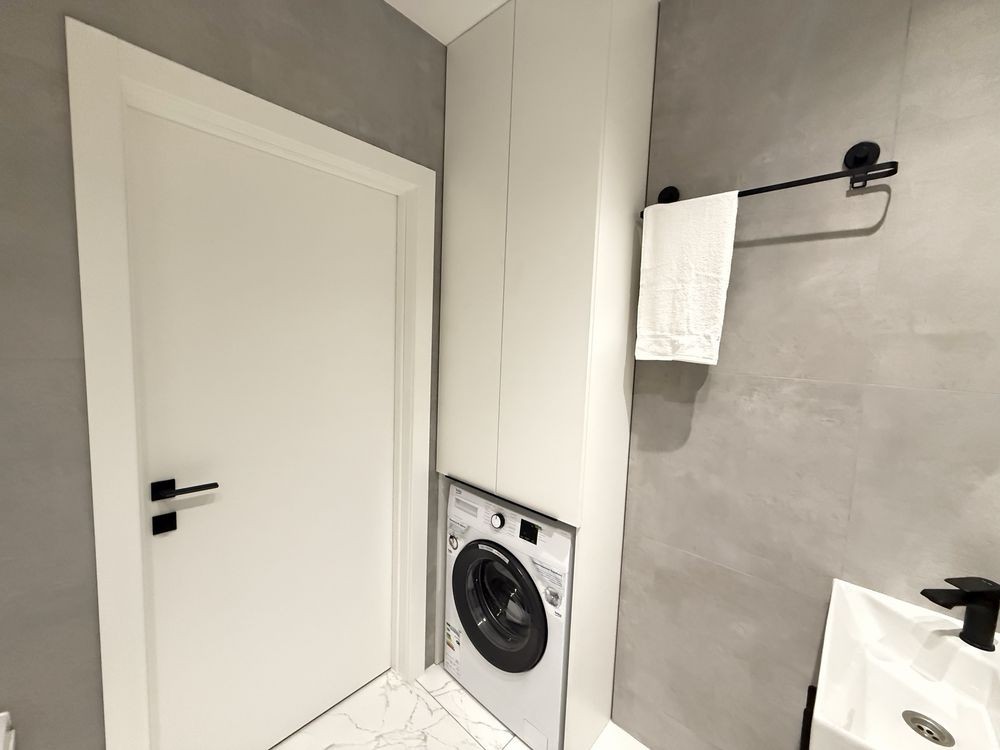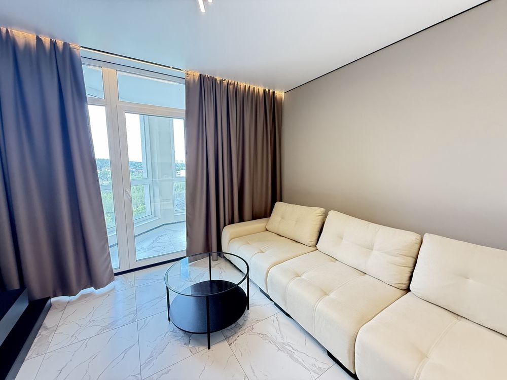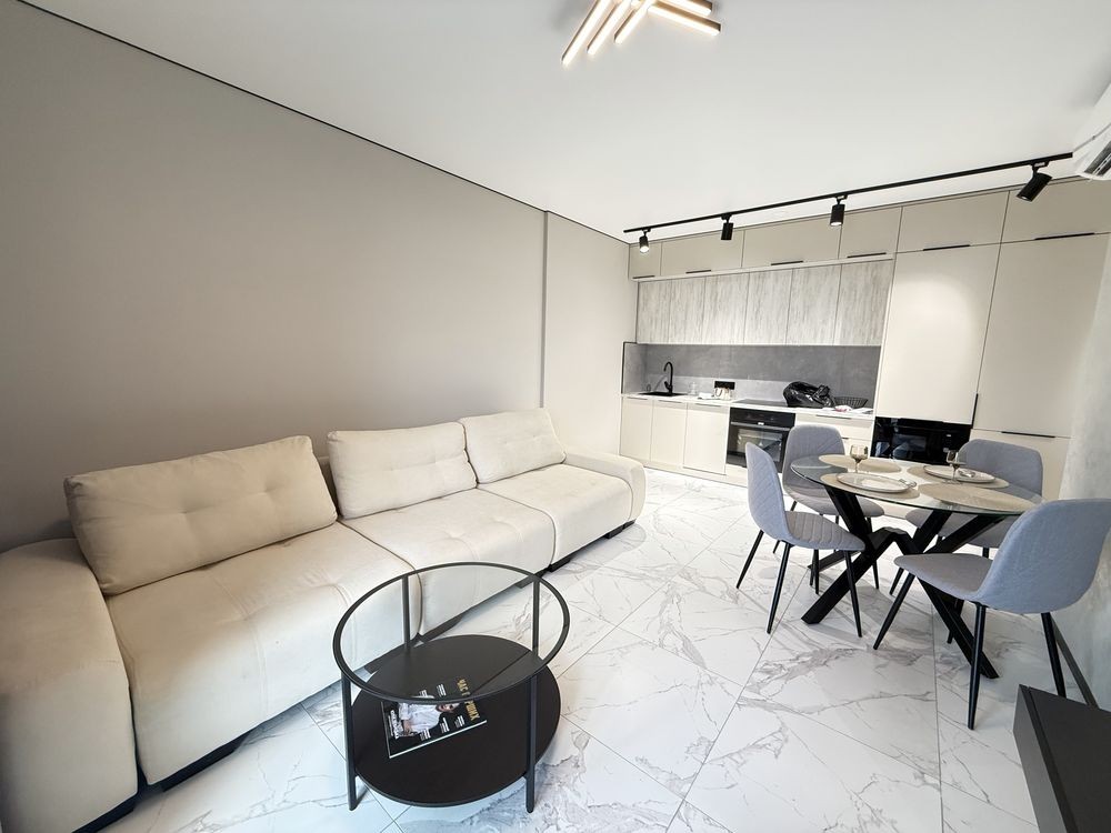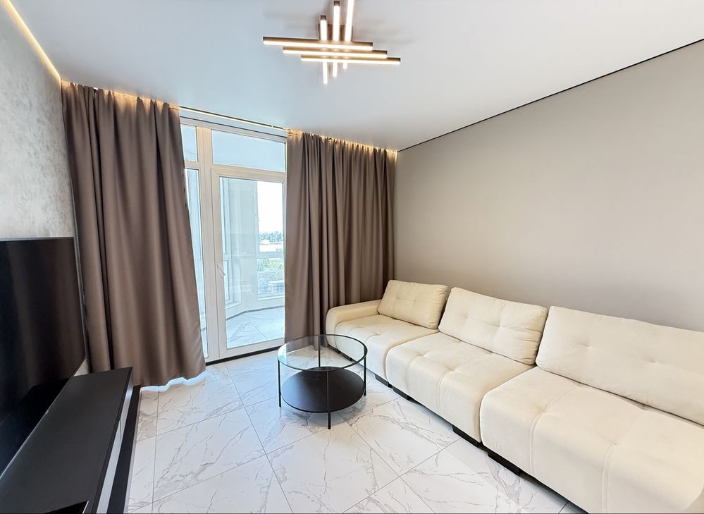 Кухня-вітальня площею 18,44 м² повністю укомплектована сучасною вбудованою технікою: індукційна поверхня, духова шафа, мікрохвильова піч, холодильник і витяжка. Також облаштована зона відпочинку з м’яким кутовим диваном ( механізм єврокнижка) і телевізором на 65 дюймів — ідеальне місце для вечірнього релаксу.
