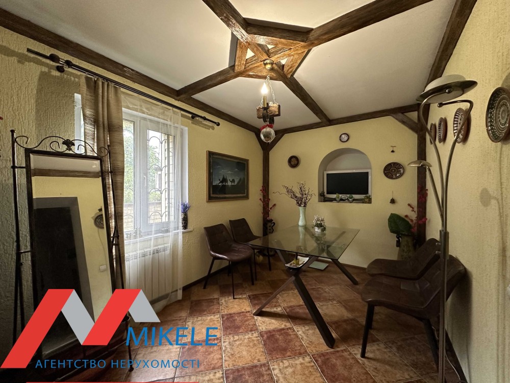 Загальна площа будинку 150м2, два житлові поверхи з трьома спальнями, двома санвузлами, великою кухнею та окремою вітальнею з каміном.