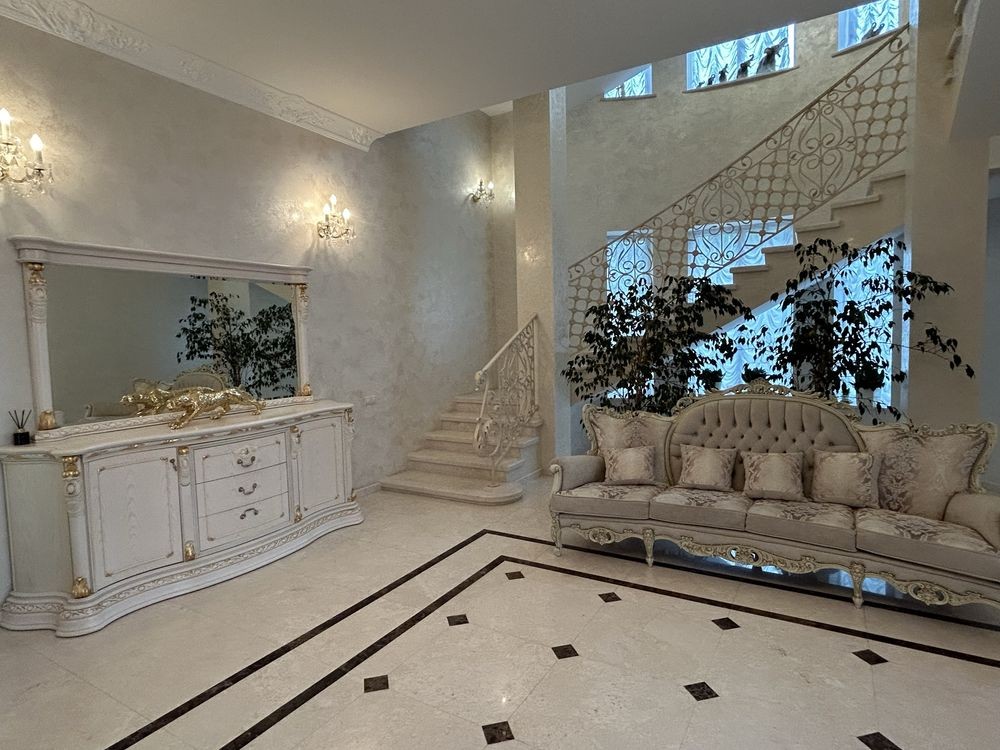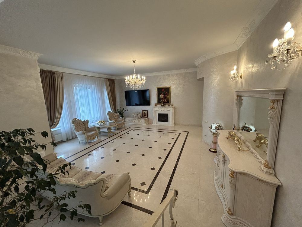 Підлога та стіни оздоблені натуральним мармуром та декоративною венеціанською штукатуркою, що надає простору благородного сяйва. Висока стеля з витонченою ліпниною та кришталевими люстрами створюють атмосферу елегантності. У центрі кімнати — камін у класичному стилі, що додає теплоти та затишку.